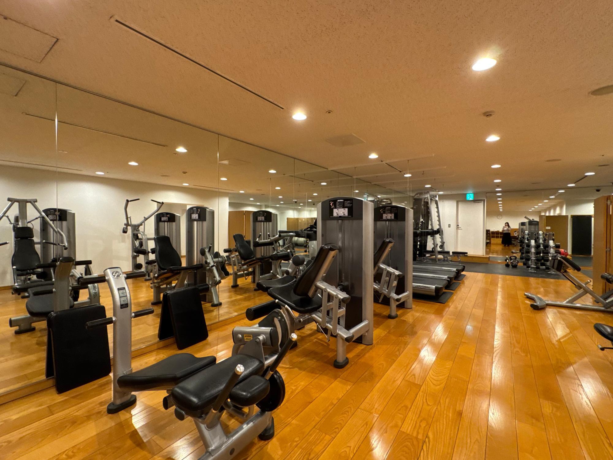 有酸素マシン、フリーウェイト、筋トレマシンが多数並ぶ本格的なジム。24時間利用でき、酵素浴との併用もおすすめです。
