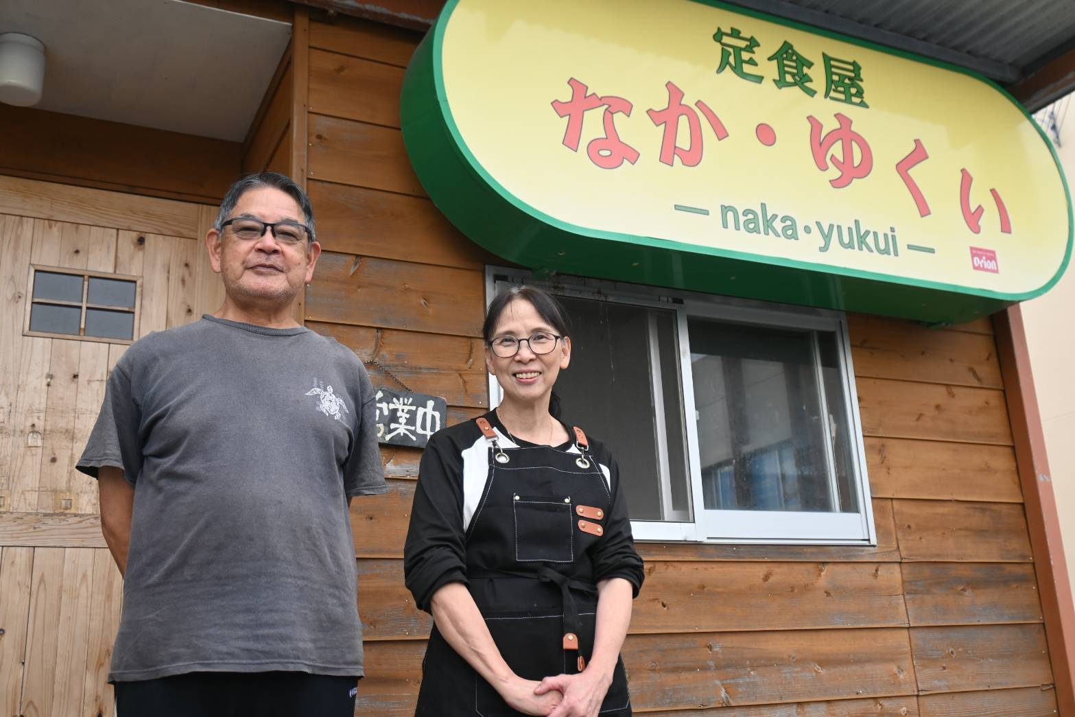同店を営む下地マリコさん(64)と功さん(65)夫婦は同市宮里の海鮮料理屋「万潮」を営んでいた。店の規模を縮小するため同市仲宗根町に店舗を移し「なか・ゆくい」の営業を始めた。