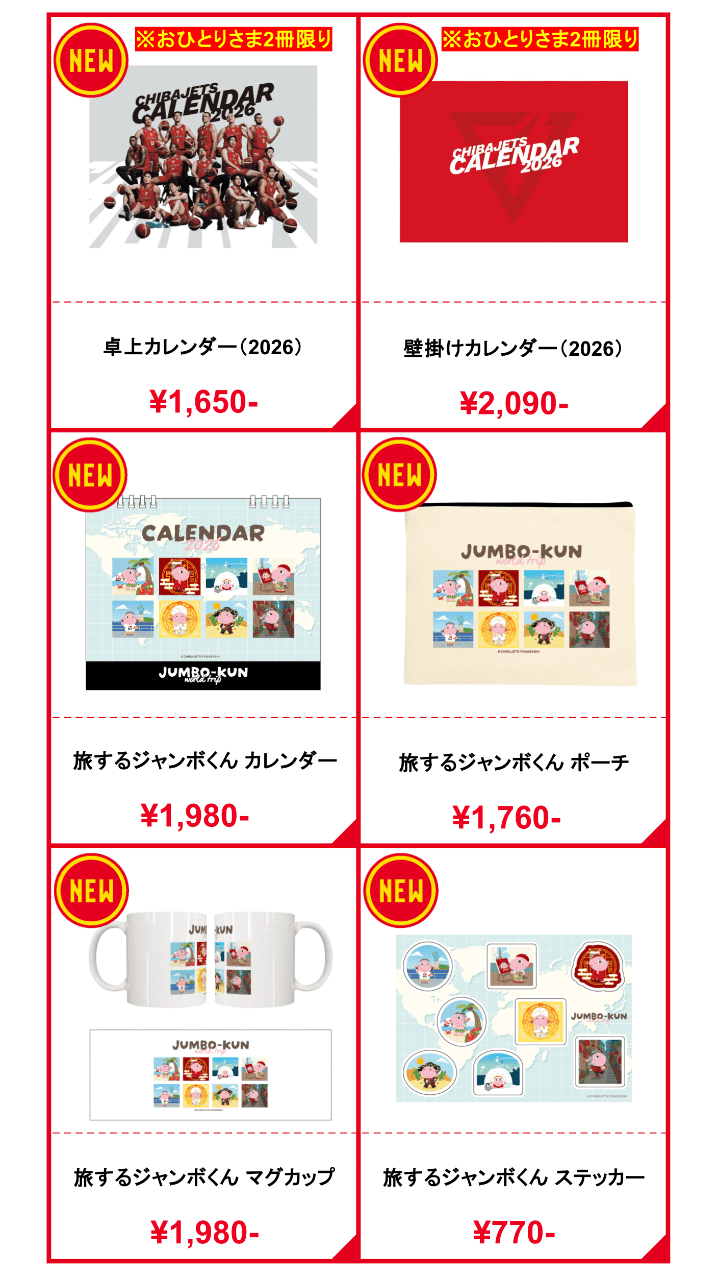 毎年大人気!2026年カレンダー2種類(卓上・壁掛け)を販売いたします。卓上カレンダーは中央でセパレートさせた仕様で、 今シーズンのポスター等の装飾広告に使用されているビジュアルを採用しています。壁掛けカレンダーはチームやホームアリーナの雰囲気を中心に、 千葉ジェッツの魅力をまるっと感じられる厳選した13枚の試合写真をピックアップしたデザインに仕上げています。