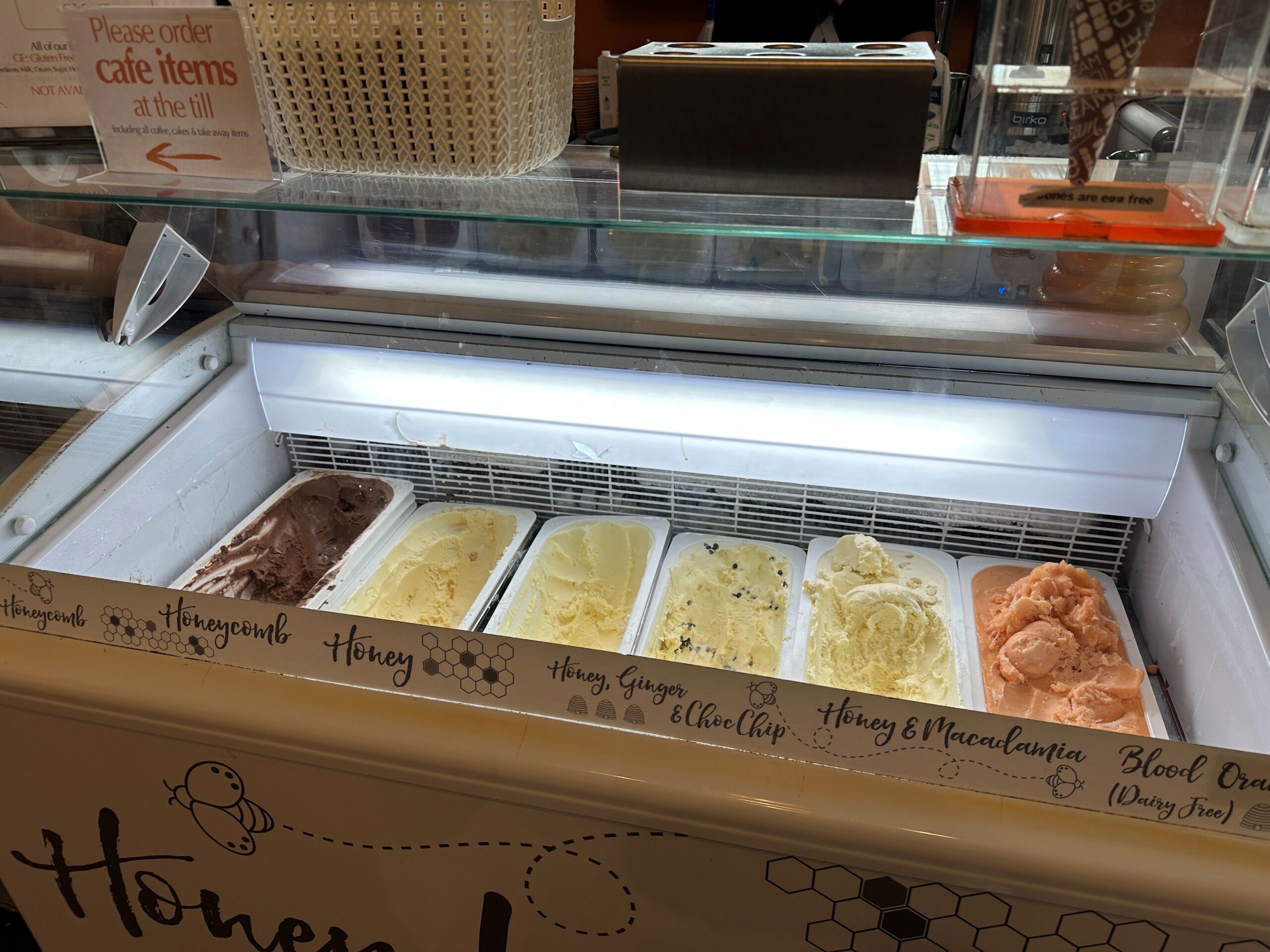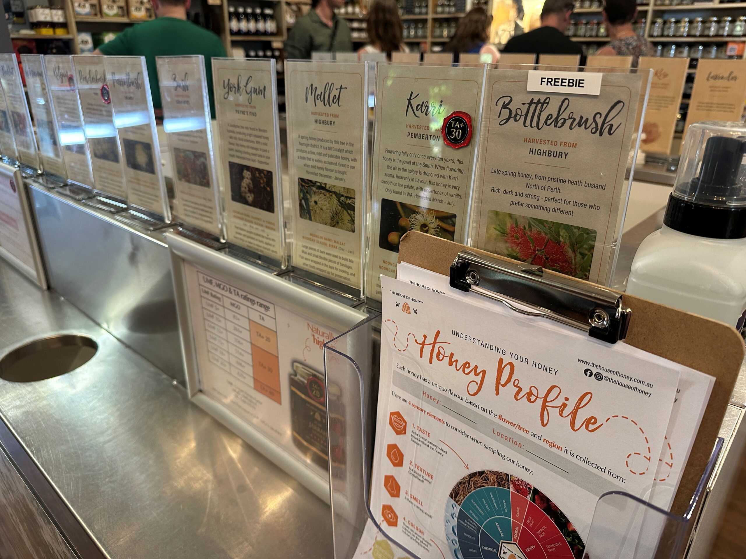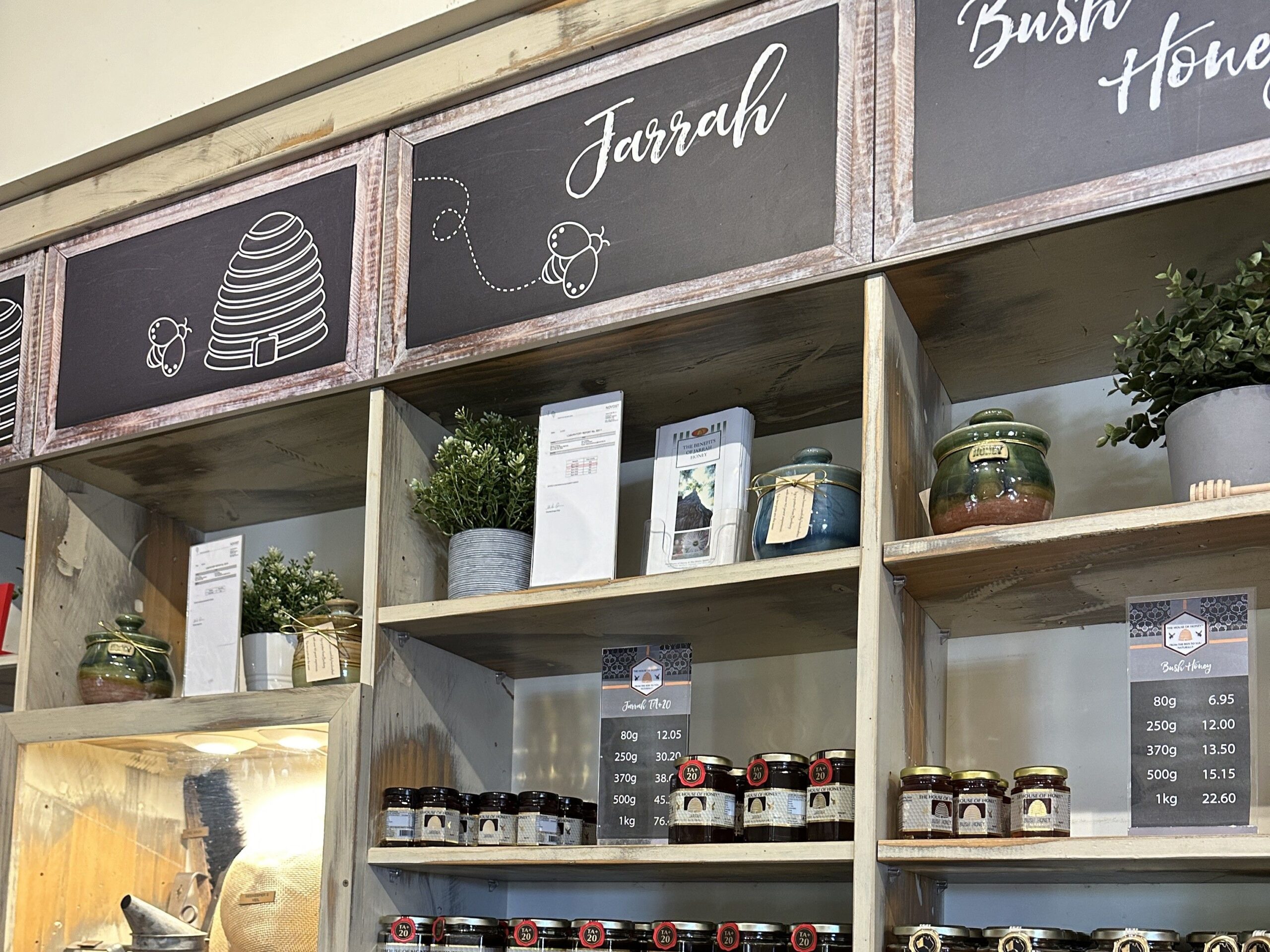 「ハチミツにそんなに味の違いなんてあるの?」実は私も、ここを訪れるまでは半信半疑でした。しかし、その疑問を一気に解消してくれるのが、ハチミツの無料テイスティングです。西オーストラリア州のどのエリアで採取されたお花なのか、ユーカリの種類は何かなど、スタッフの説明を聞きながら味わうことで、同じはちみつでもこんなに風味が変わるのかと驚かされます。テイスティング自体もとても楽しい体験でした。2025年12月現在は、特にテイスティングの回数制限などは設けられておらず、気に入った味を伝えるとスタッフがテイスティング用に出してくれる仕組みでした。