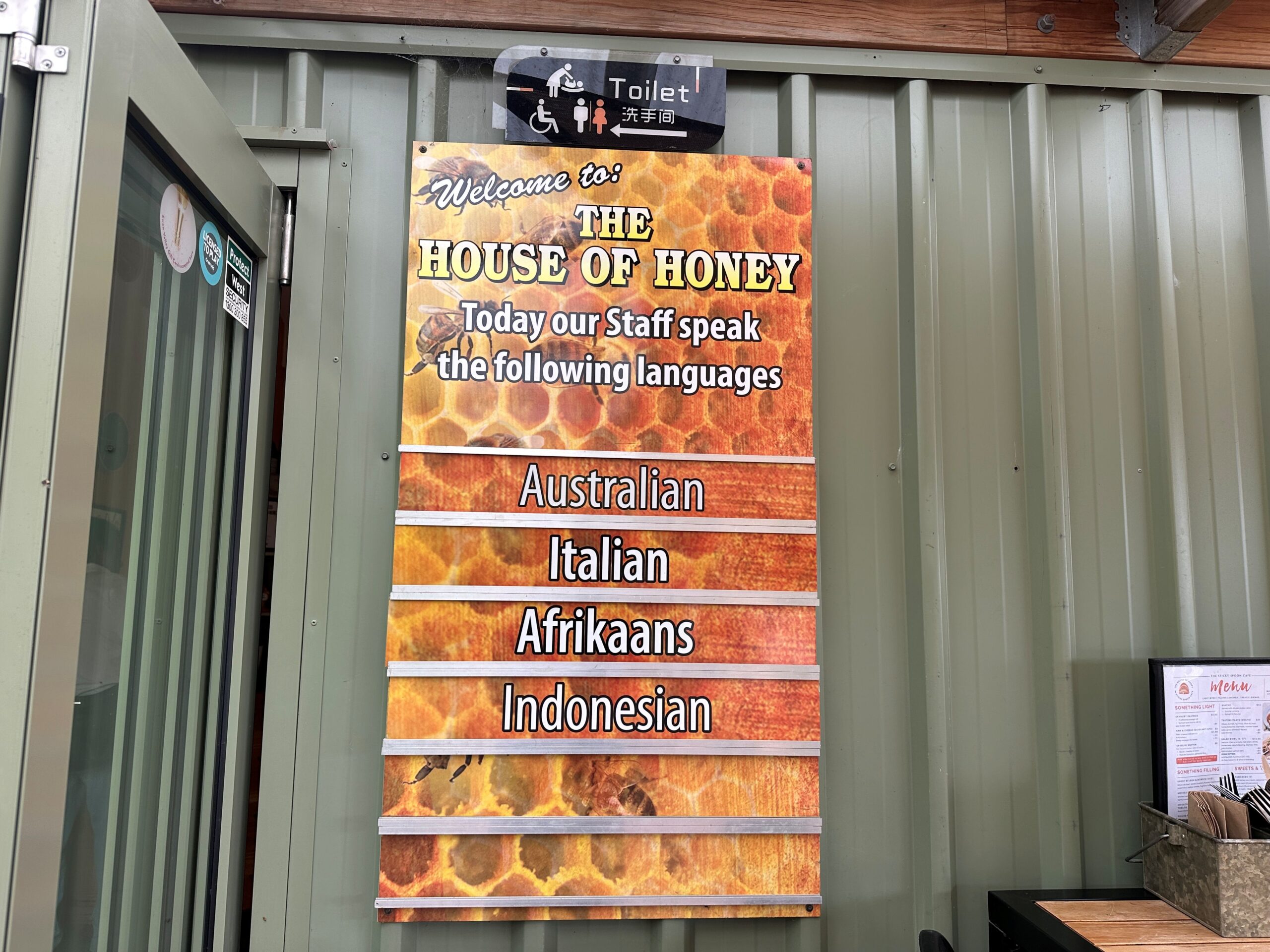 店内に入ってまず目を引くのが、その日に働いているスタッフを「働きバチ(Worker Bee)」に例えた、可愛らしい言語ボード。入口には、その日に対応可能な言語がスタッフ名とともに掲示されており、日本人スタッフの方も数名在籍しています。現在の The House of Honey は、30名以上のスタッフ、500の巣箱、そして約5,000万匹のミツバチ を抱える大きな施設へと成長しました。世界中から訪れる観光客に対応できる体制が整っているのも、ここが多くの人に支持されている理由のひとつです。