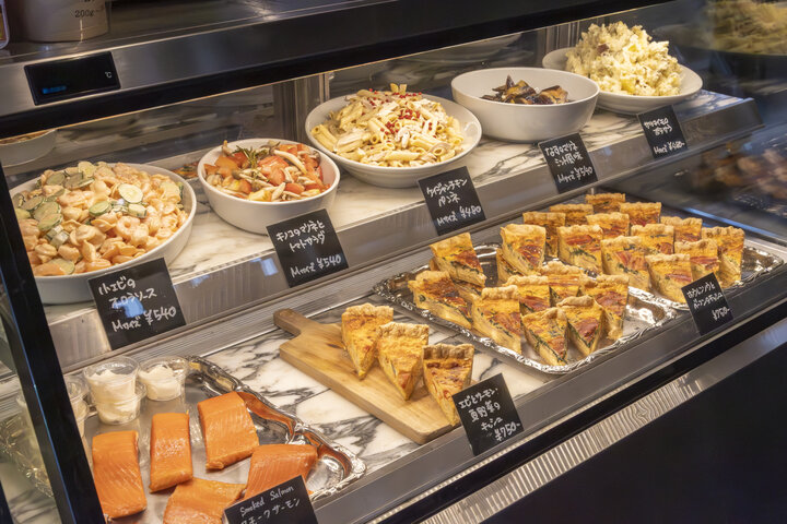 左手にはデリのテイクアウトコーナーが。ショーケースをのぞくと、ポテトサラダ、マリネなど常時5〜6種類の季節のデリ、2 種類のキッシュ、スモーク系が並んでいます。