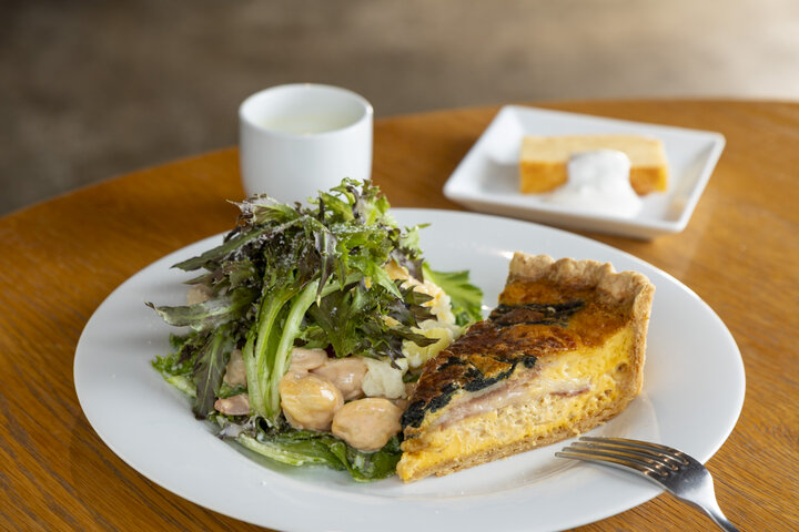 キッシュを味わいたい方は「キッシュSET」を。サラダ仕立てのデリと季節のスープ、プチデザートが付いています。ランチタイムはプラス300円でドリンクバーもあり、自家製ハーブティーやコーヒーが用意されているので付けるのがおすすめです。