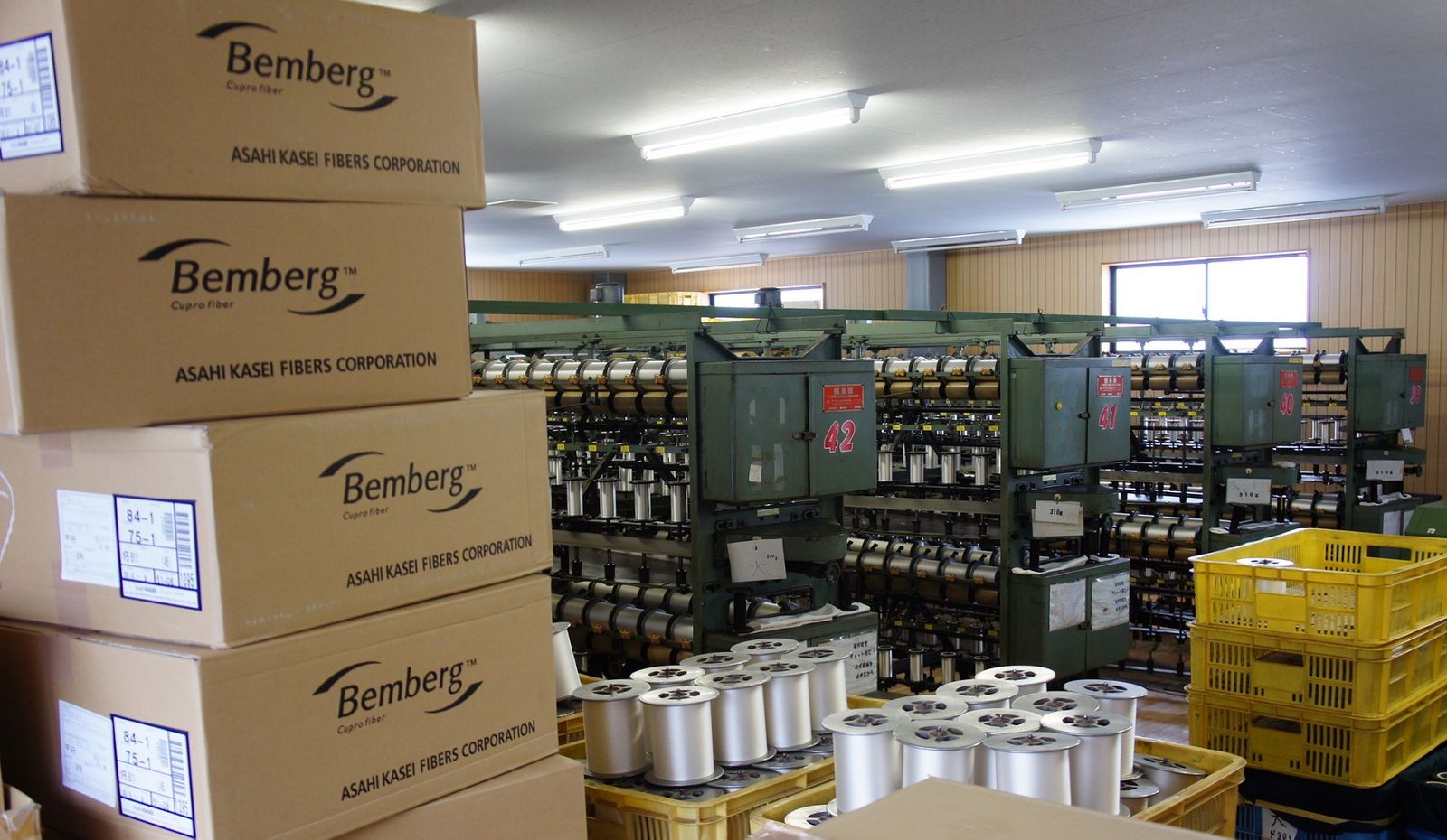 富士吉田市にある裏地の生産工場。旭化成の「ベンベルグ」を使っている