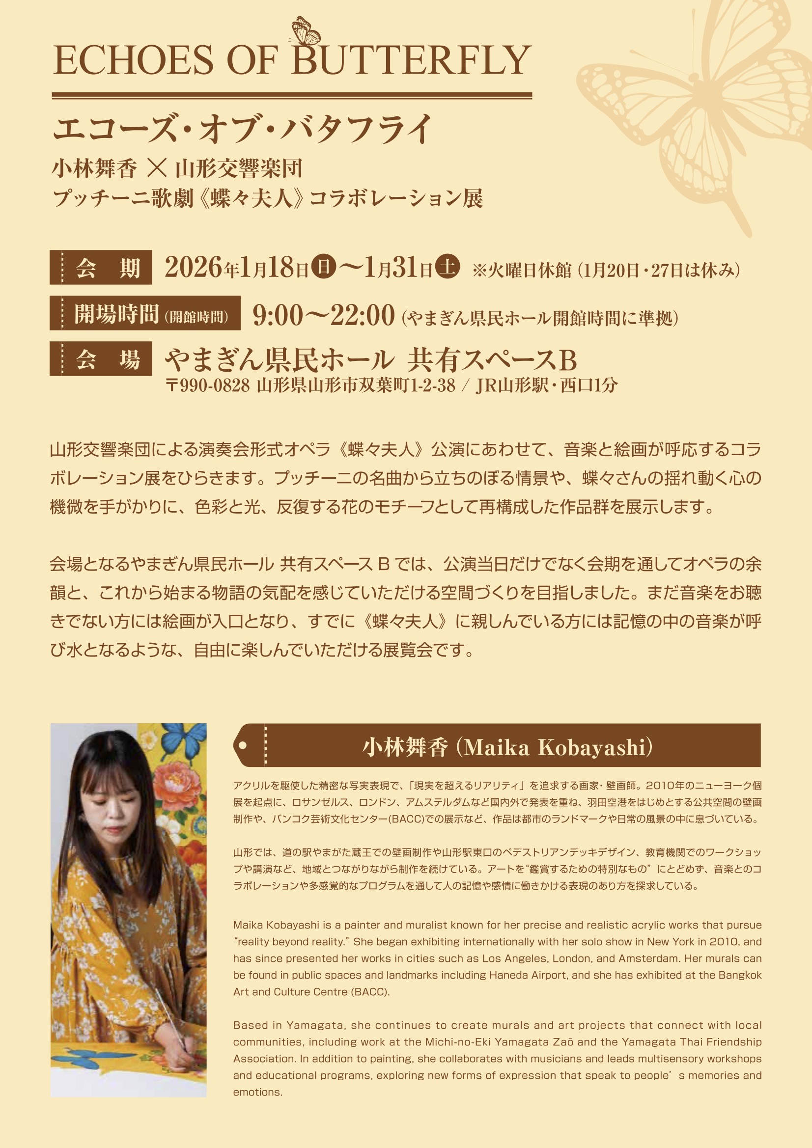 山形イベント情報1/18-1/31】ECHOES OF BUTTERFLY(エコーズ・オブ・バタフライ)小林舞香 × 山形交響楽団 プッチーニ歌劇《蝶々夫人》コラボレーション展