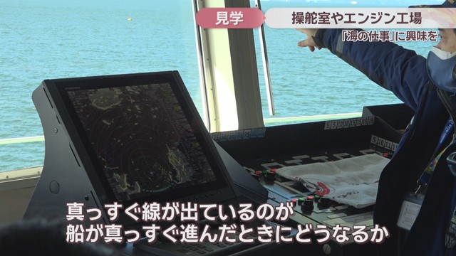 児童たちは操舵室の設備について船員から説明を受け、船を動かす仕組みを学びました。
