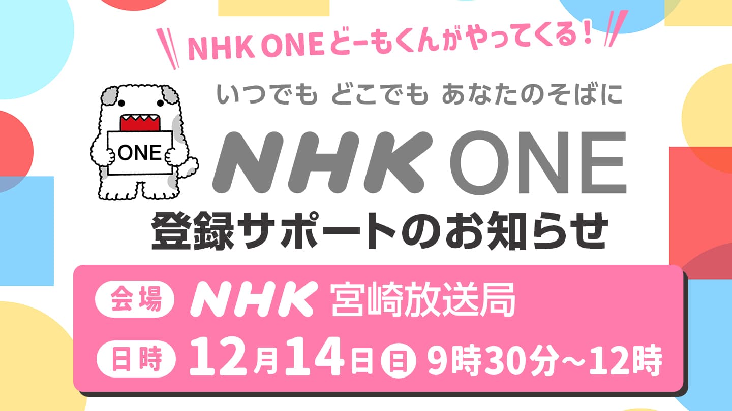 NHK宮崎放送局の会館内では、12月26日(金)までの平日にも、次のとおり登録サポートを実施しています。「NHK ONE」のサービスについてご不明な点のある方、登録サポートをご希望の方は、お気軽にお越しください