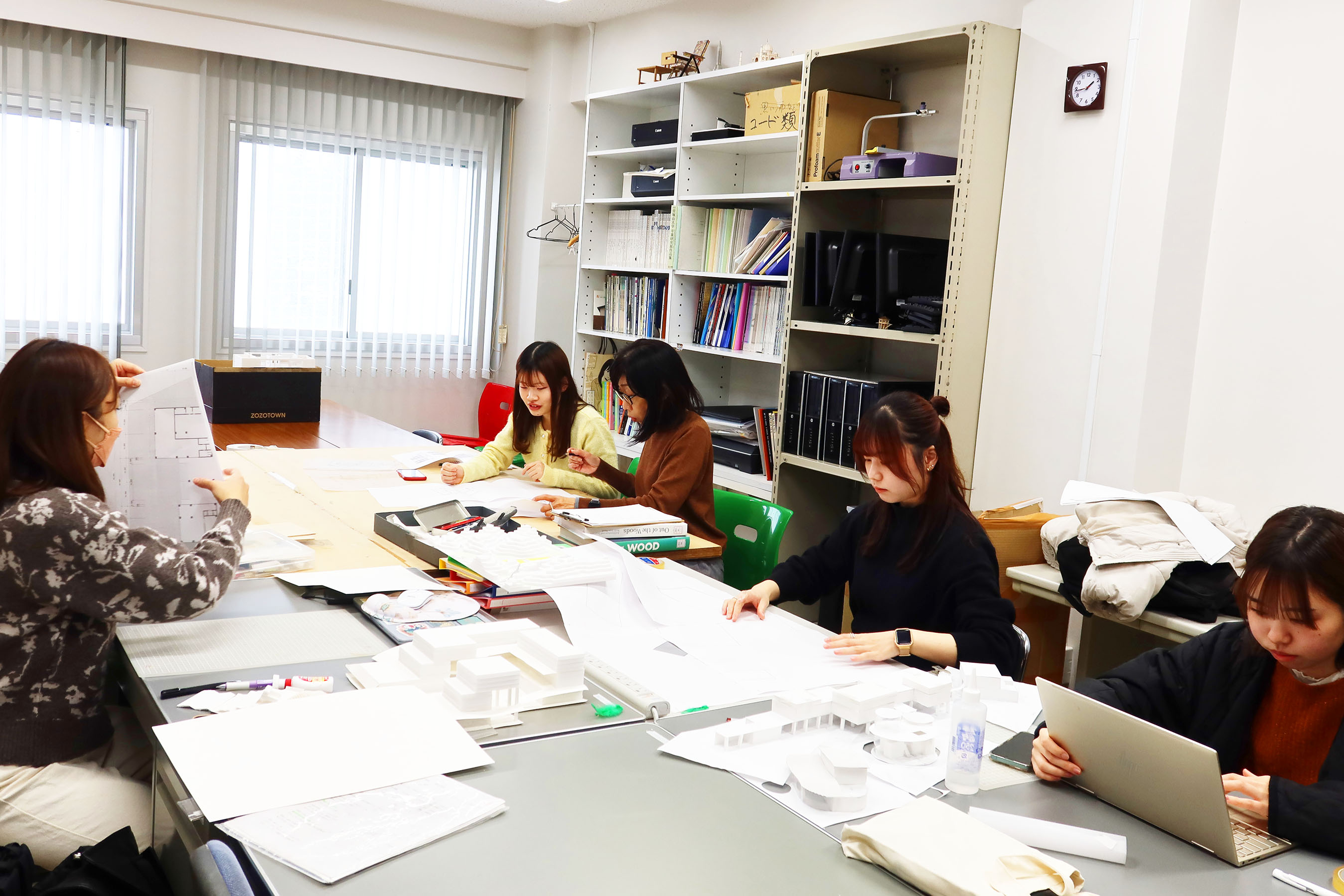 矢部ゼミでは、各自が設定したテーマに基づいて進めてきた卒業設計・卒業制作がいよいよ追い込みの時期を迎えています。 学生たちは先生の丁寧な指導を受けながら、図面や模型に向き合い、真剣な表情で制作に取り組んでいました。 ゼミ室には熱気が満ち、作品が形になっていく瞬間に立ち会える貴重な時間となっています。 © 2019 Tezukayama University Nara 奈良 奈良県 居住空間デザイン学科 帝塚山大学 現代生活学部