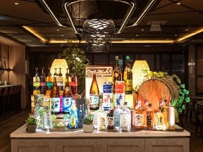 アルコール含むドリンクを自由に作って楽しめる夜の「ウェルカムバー」。中津川の地酒のほか、近隣テーマパーク「ちこり村」で作られる焼酎「ちこちこ」などが並ぶ