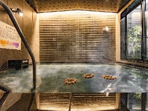 天然温泉「恵那峡の湯」。風呂椅子と桶には岐阜県東白川村産ヒノキを活用