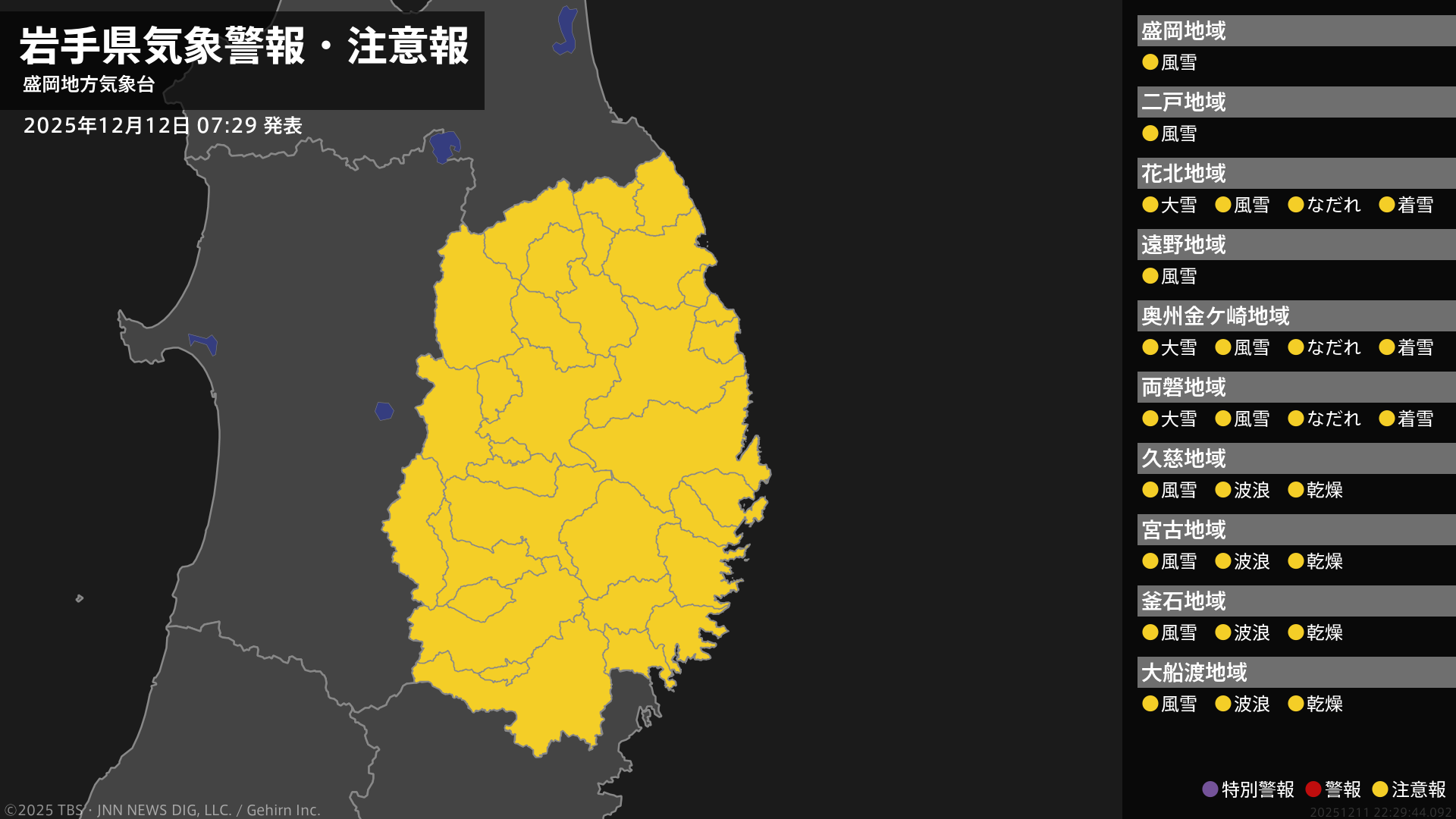 気象台は、午前7時29分に、なだれ注意報を花巻市、北上市、一関市、奥州市、西和賀町、金ケ崎町に発表しました。
