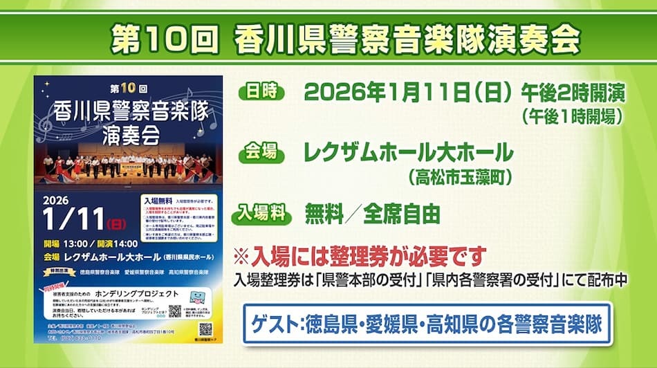 2026年1月11日、レクザムホールで「第10回 香川県警察音楽隊演奏会」を開催!日頃の訓練成果を披露し、音楽を通じて県民の皆さんとの触れ合いを深め、警察を身近に感じてもらうコンサートです。
