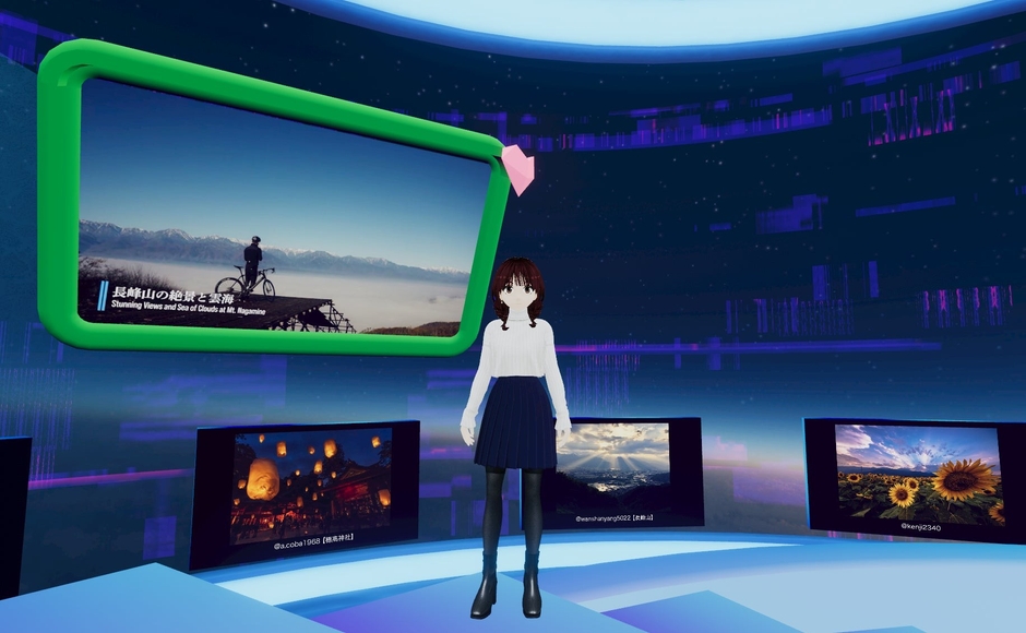 「安曇野観光メタバース」は北アルプスの美しい山々を背景に、清流や広大な田園風景が広がる安曇野市を体験できる空間です。現地のおすすめスポットが空間内で紹介されており、旅の計画を立てるのにも役立ちます。