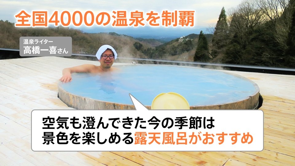 全国4000の温泉を制覇したという温泉ライターの高橋一喜さんによると、「空気も澄んできた今の季節は、景色を楽しめる露天風呂がおすすめ」だということです。