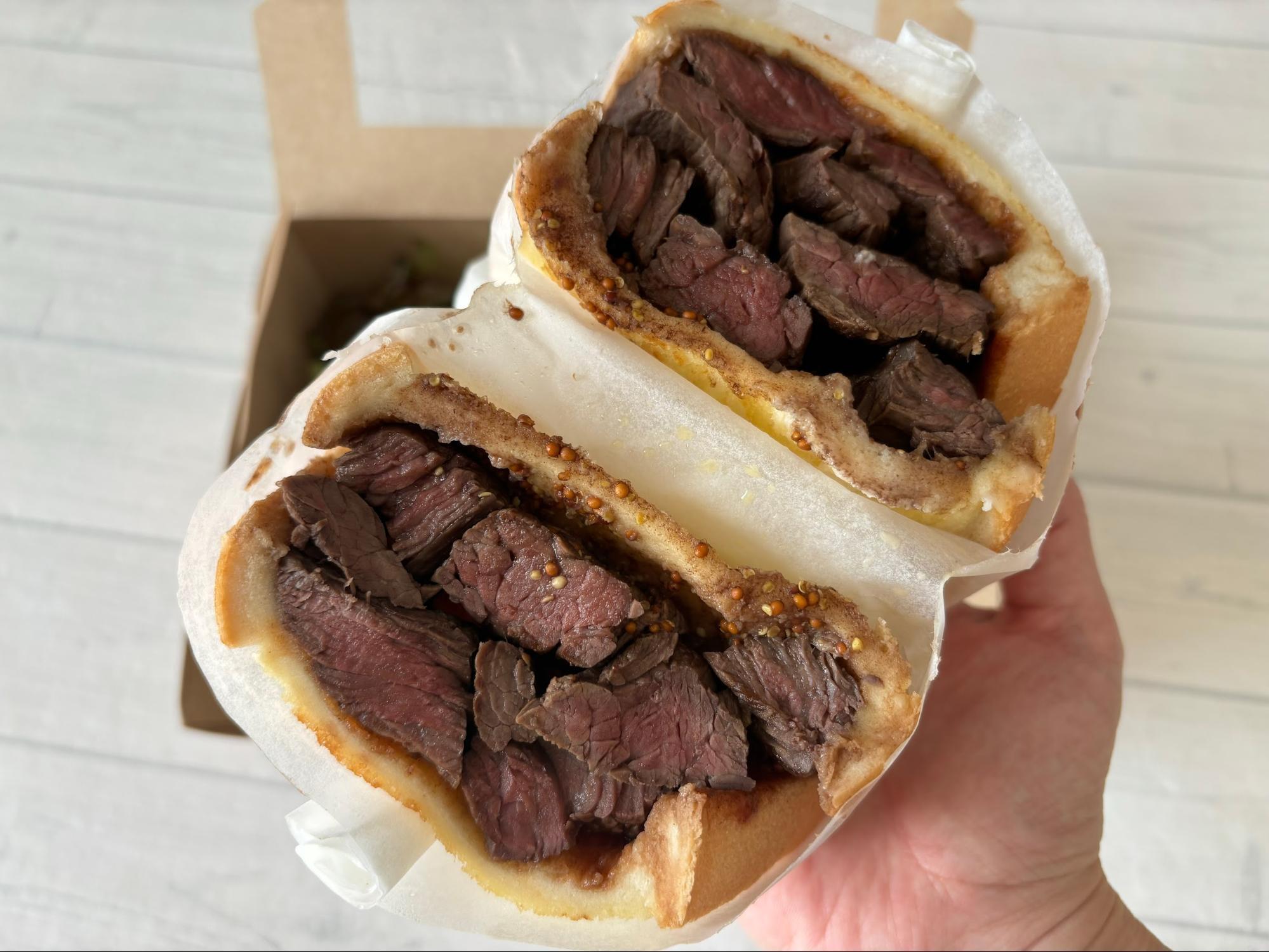 看板メニューは“250gのサガリ肉”を挟んだ迫力満点のサンドウィッチ。