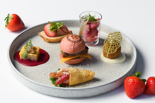 苺とフォアグラのムース / 桜島美湯豚と野菜のスペイン風オムレツ / 鹿児島県産白身魚のマリネ、苺ドレッシング / ハモンセラーノと苺のクレープ包み / 鹿児島県産黒毛和牛パティのスライダー / ベーコンとほうれん草のクリームコロッケ