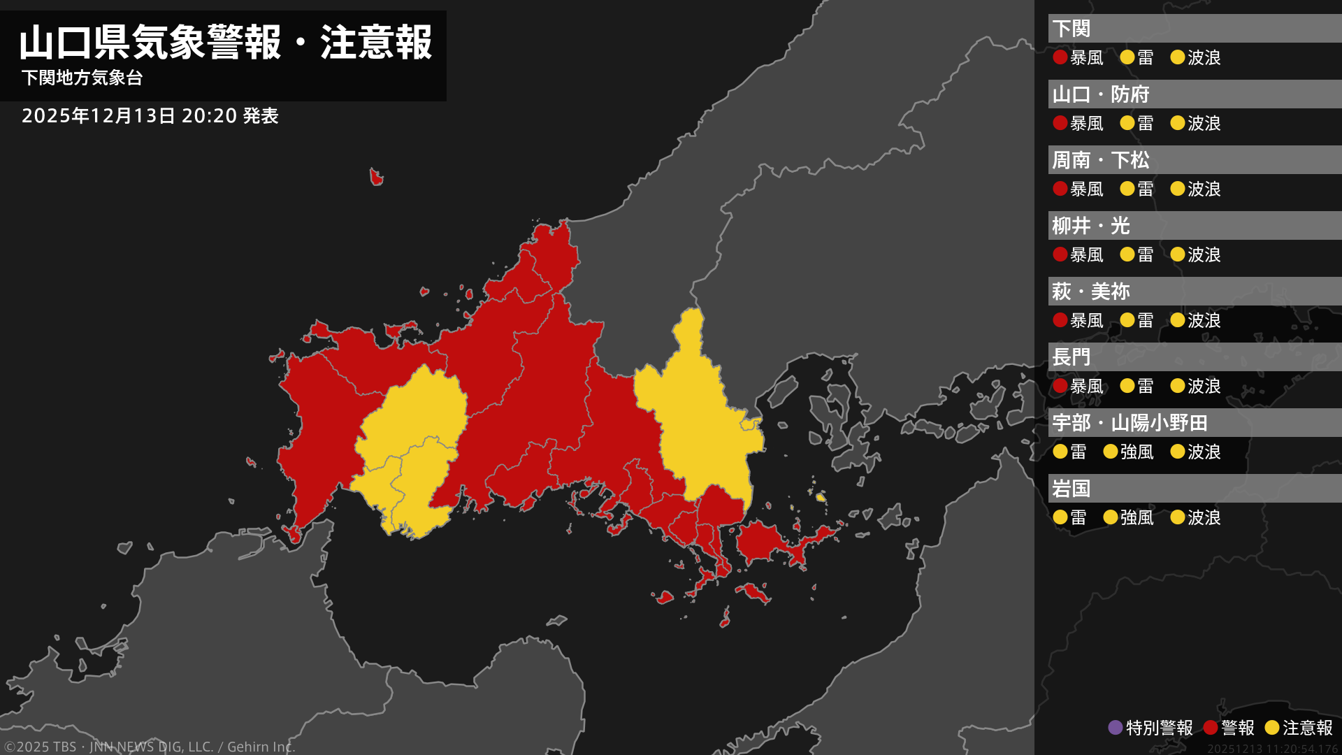【暴風警報】山口県・山口市、防府市、下松市、光市、柳井市、周南市などに発表 13日20:20時点