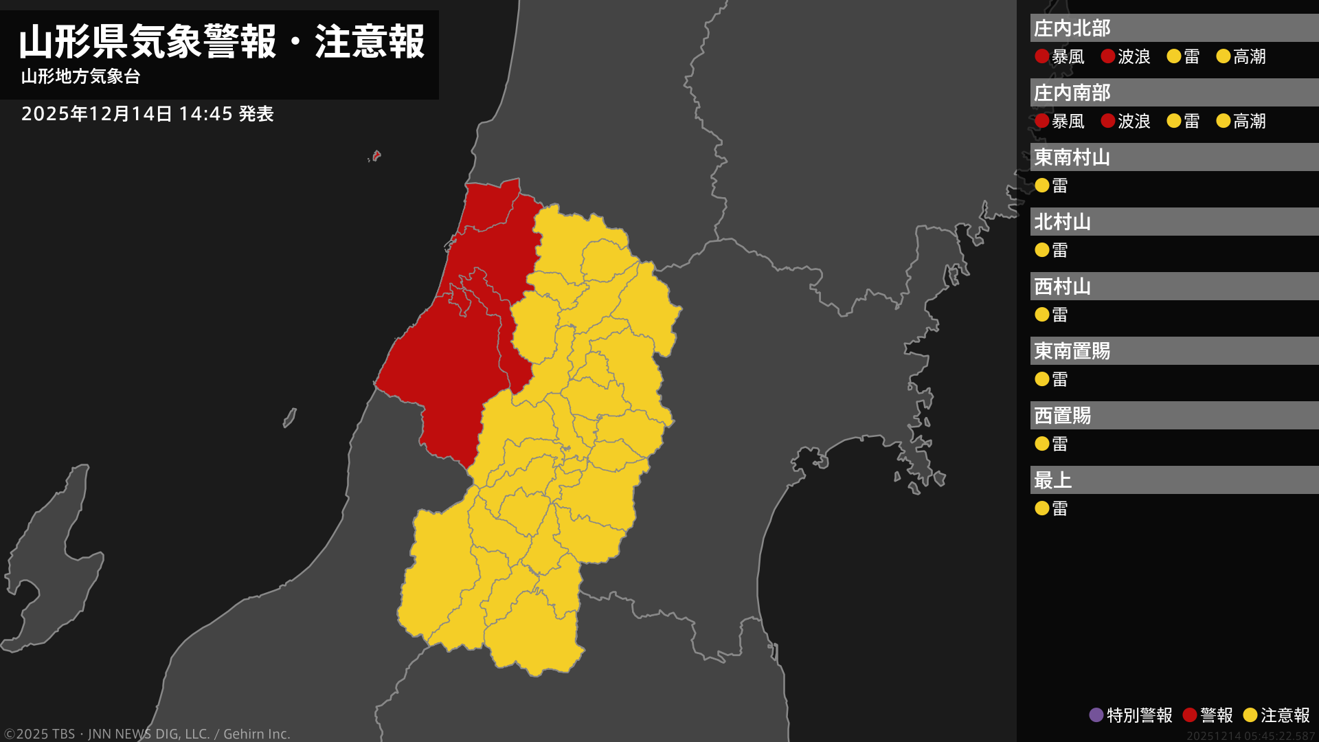 気象台は、午後2時45分に、波浪警報を鶴岡市、酒田市、遊佐町に発表しました。