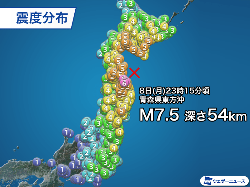 8日(月)23時15分頃、青森県東方沖を震源とするマグニチュード7.5、深さが54kmと推定される地震が発生しました。この地震で青森県八戸市で最大震度6強、おいらせ町と階上町で震度6弱を観測しています。