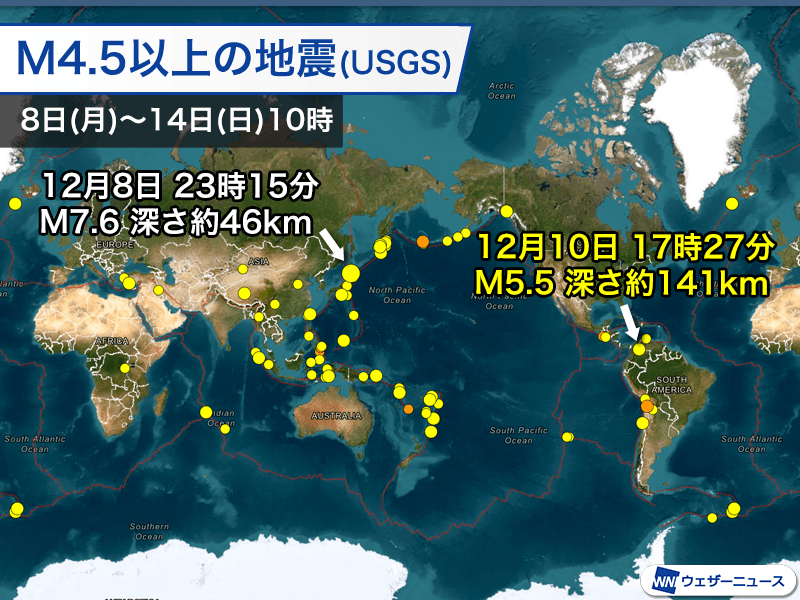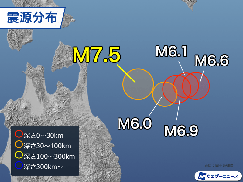 アメリカ地質調査所の解析によるマグニチュード6以上の地震は3回発生しました。3回の地震はすべて前述の青森県東方沖を震源とする地震です。