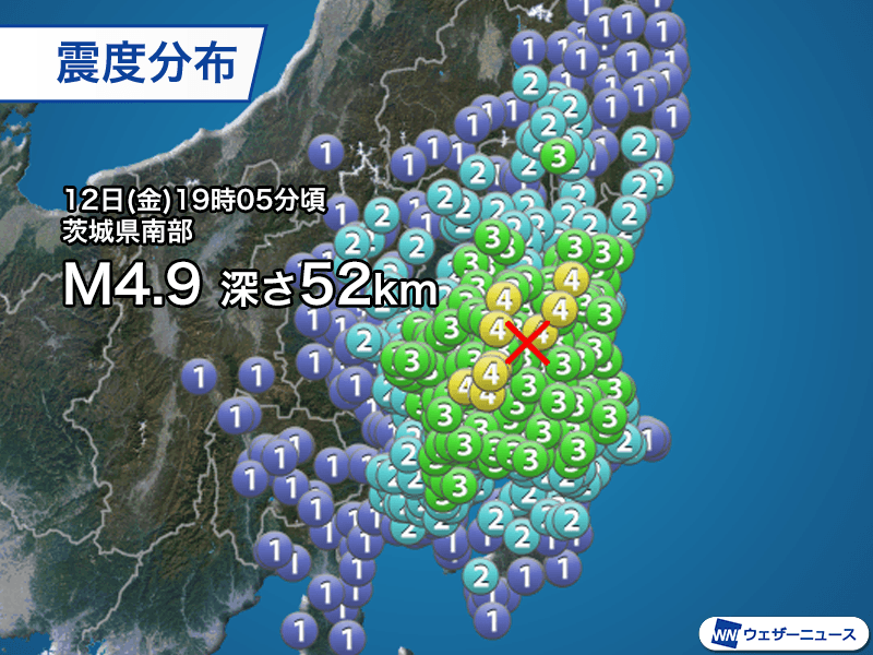 12日(金)19時05分頃、茨城県南部を震源とするマグニチュード4.9、深さ52kmの地震が発生しました。この地震で茨城県石岡市、笠間市、筑西市、坂東市、城里町、栃木県真岡市、埼玉県春日部市、千葉県野田市で最大震度4、関東の広い範囲で震度3を観測しています。