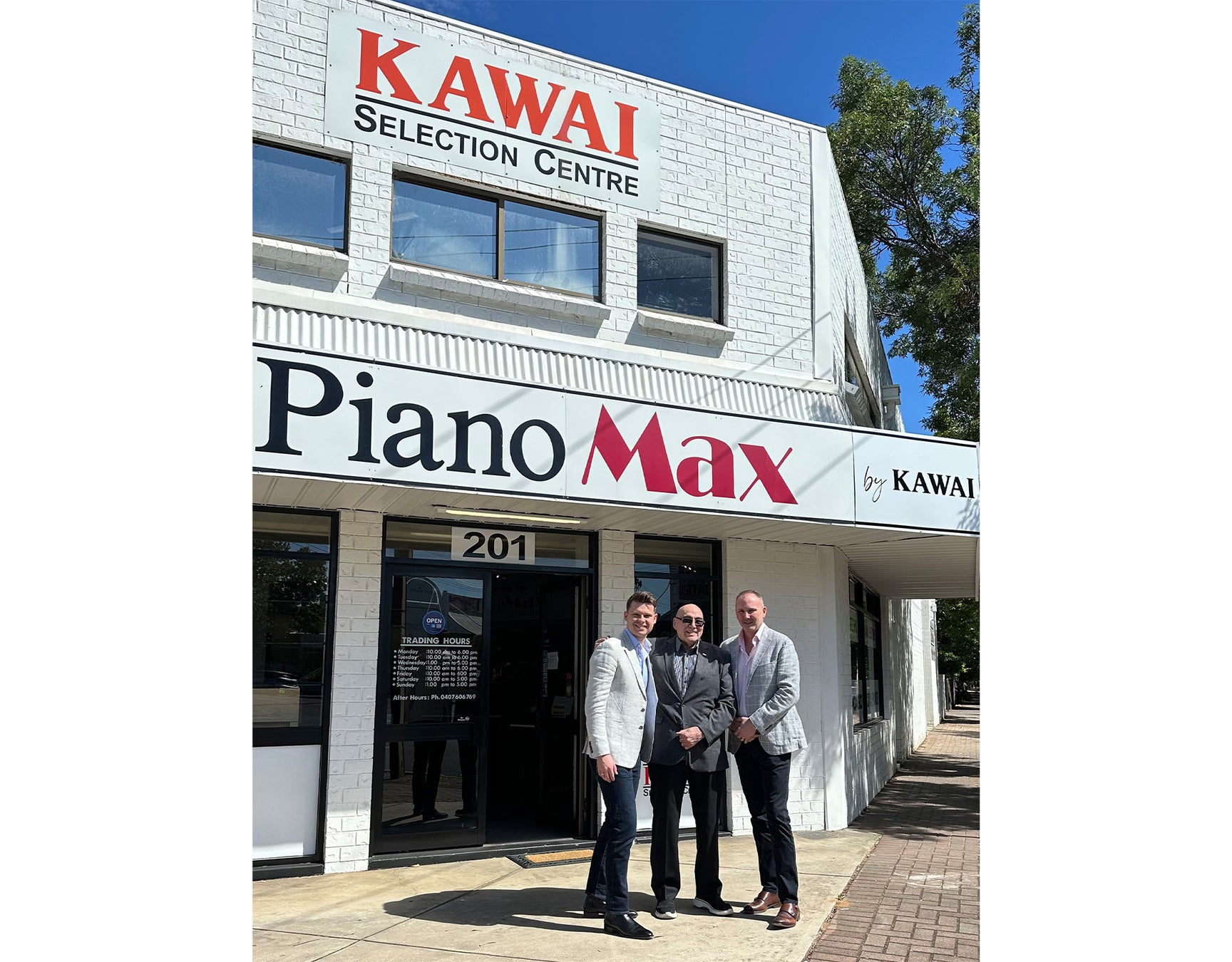 左:サム・ブランチャード=ジャクソン(PianoMax by Kawai店長/カワイ オーストラリア従業員) / 中央:ネヴィル・オレオ氏(PianoMax社 前オーナー)/右:ウォリック・ベイカー(カワイ オーストラリア ゼネラルマネージャー)