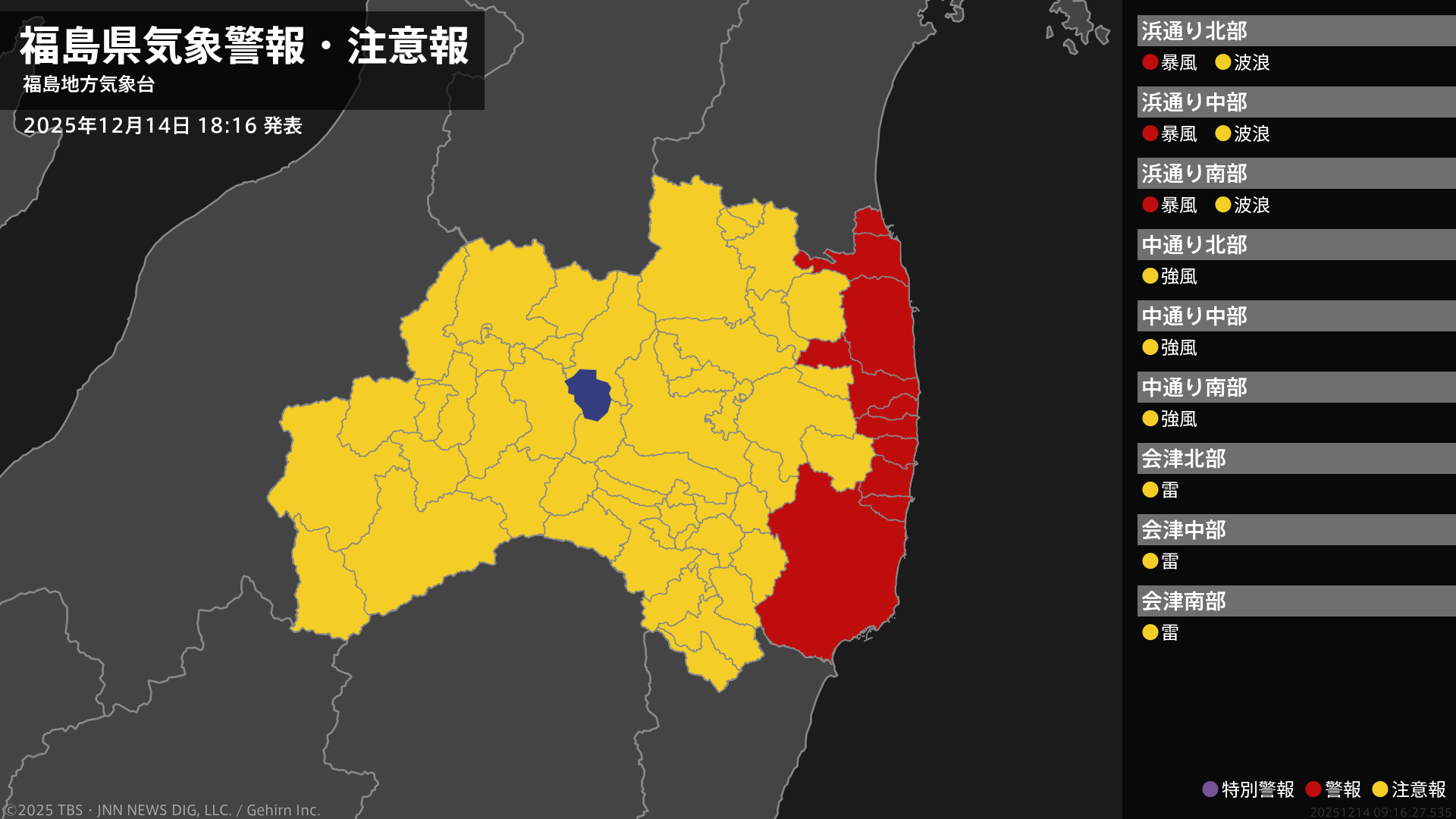 【暴風警報】福島県・いわき市、相馬市、南相馬市、広野町、楢葉町、富岡町などに発表 14日18:16時点