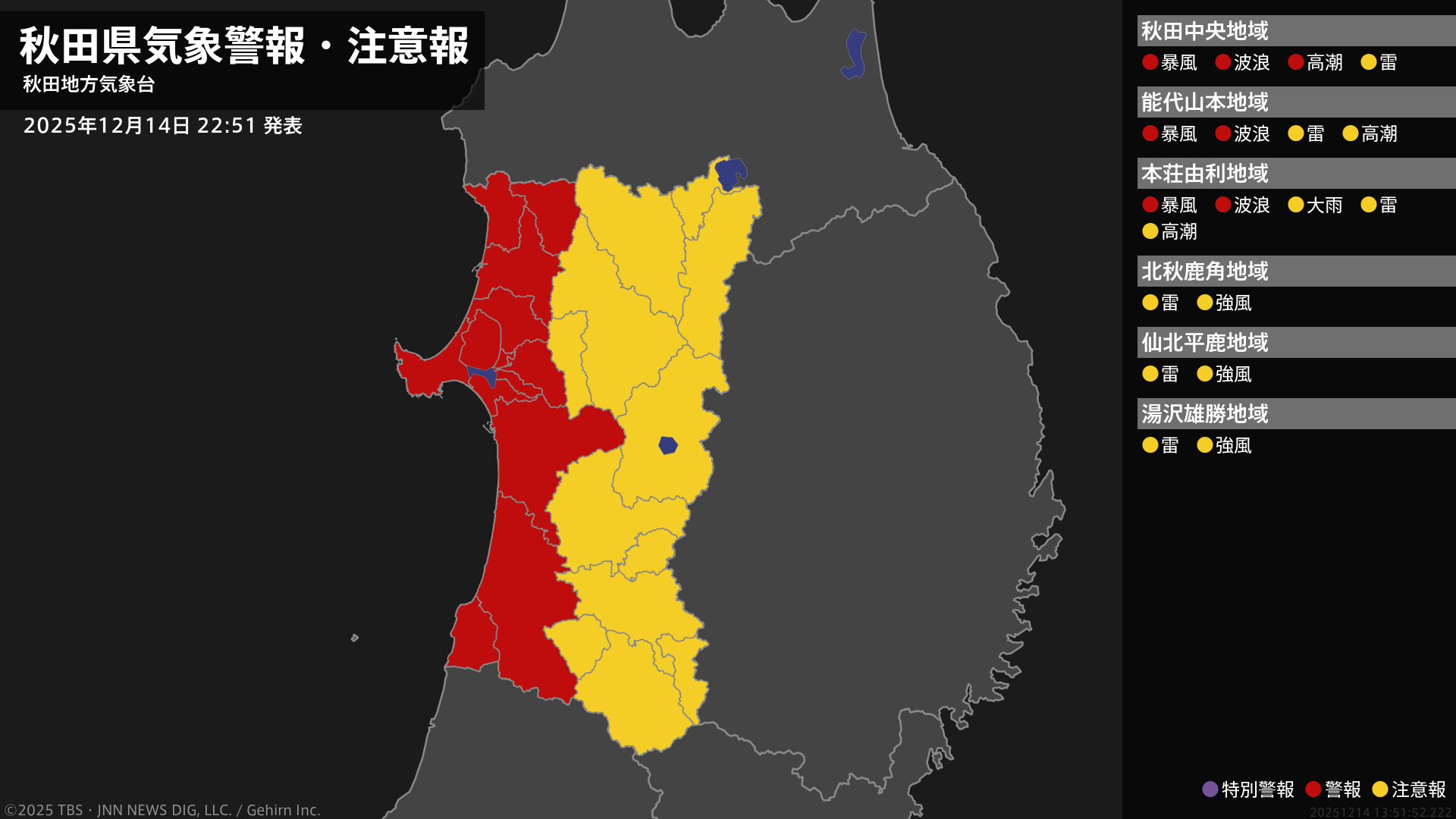 【高潮警報】秋田県・男鹿市、潟上市に発表 14日22:51時点