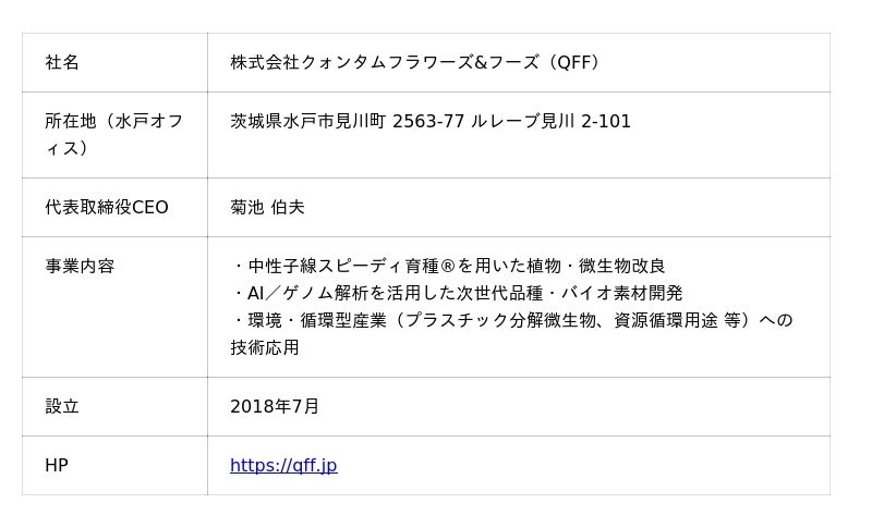 株式会社クォンタムフラワーズ&フーズ(QFF)は、独自の高速育種技術「中性子線スピーディ育種(R)」をコアとし、植物や微生物の改良、新素材・バイオソリューションの開発を行うバイオテックベンチャーです。本技術は、従来の育種技術に比べて育種サイクルを大幅に短縮できる点が特長で、とりわけ微生物の改良を活用した環境負荷の低減、循環型素材、バイオマテリアルなど多様な分野への応用が期待されています。