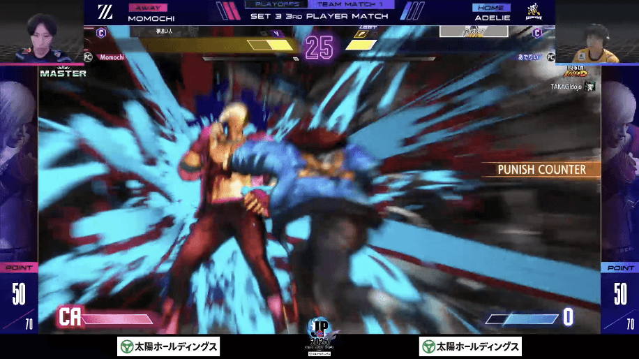 1巡目で勝利しているももちは、距離を詰めて相手の裏側に回る「サイコナックル」を効果的に使い、早々にリーチをかける。しかし、あでりいも体力不利から無敵技の「ODサイコアッパー」や「ドライブインパクト」などで追いすがる。フルセットの末、最後はラッシュ止めから的確なSAまでのコンボをきっちり叩き込んだあでりいがZETAに引導を渡した。