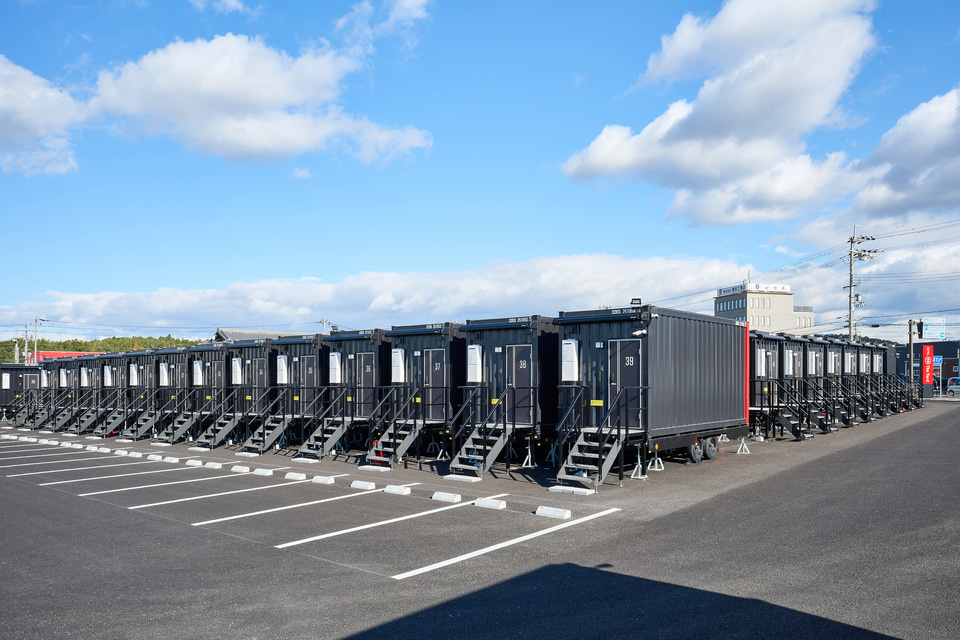 「HOTEL R9 TheYard」シリーズは全国121店舗展開するコンテナホテル。隣市の東近江店と甲賀店、近隣の湘南店との連携体制を構築しており、有事の際は、客室を被災地へ移設して避難施設「レスキューホテル」として稼働する。