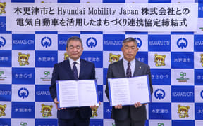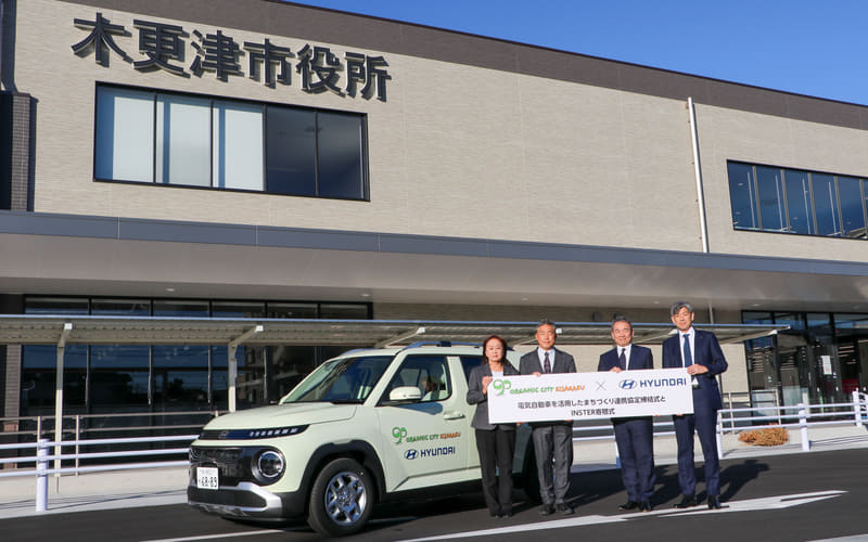ヒョンデ(Hyundai Mobility Japan)と木更津市は12月15日、「電気自動車を活用したまちづくり連携協定」の締結式を木更津市役所朝日庁舎で実施した。2026年1月5日に開庁する朝日新庁舎では、スモールBEV(バッテリ電気自動車)「インスター」の贈呈も行なわれ、木更津市は公用車やイベント、災害時の電源などに活用する。