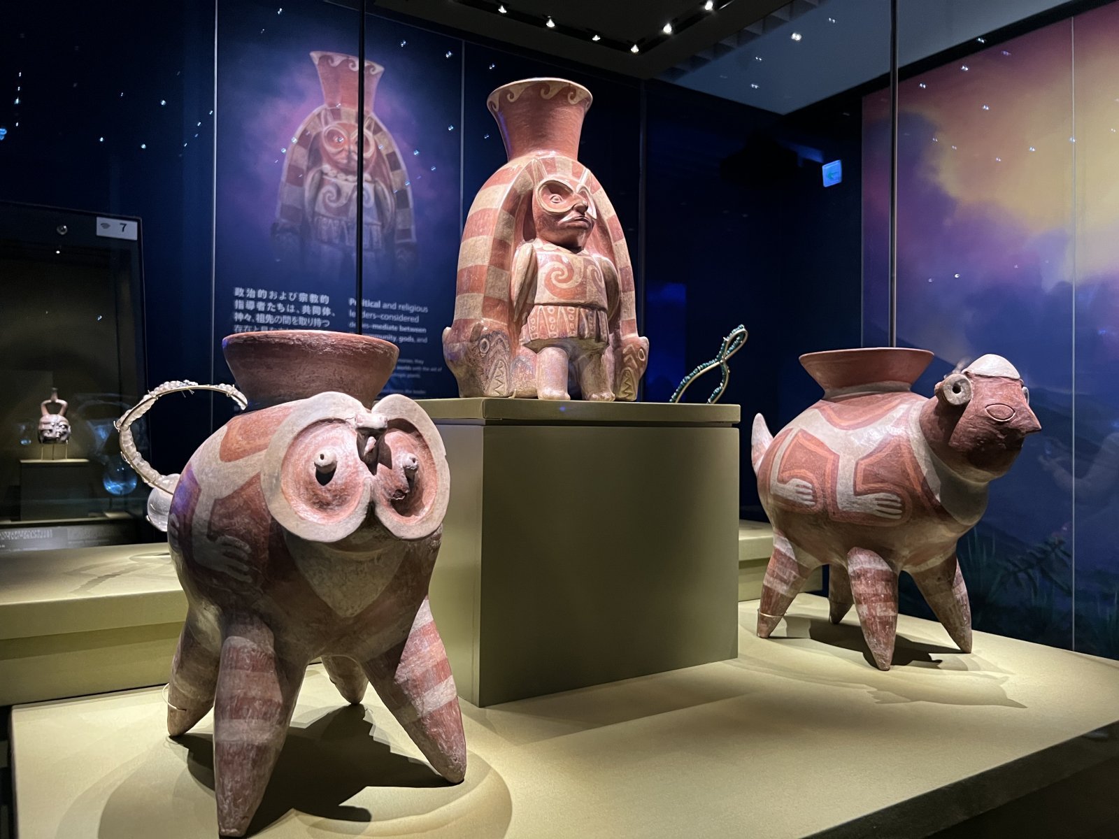 「マチュピチュ展」展示風景。左奥:『山々の上を飛ぶアイ・アパエック』 鐙型注口土器 モチェ文化(西暦100〜800年) 北部沿岸地域 ラルコ博物館、リマ(ペルー) © MUSEO LARCO LIMA – PERU