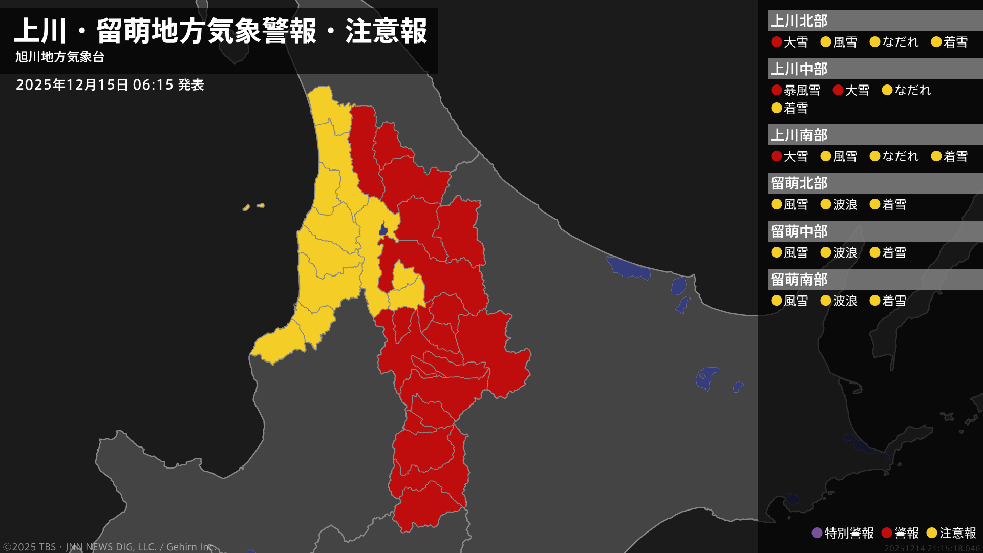 【暴風雪警報】北海道・旭川市、鷹栖町、東神楽町、当麻町、比布町、愛別町などに発表 15日06:15時点