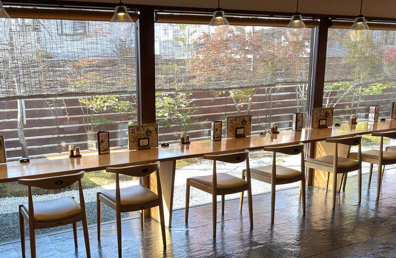 お庭が見える窓辺のカウンター席もお洒落で、テーブルと座敷席もあり、全65席分とのこと。静かなピアノBGMと丁寧な接客も安定感あり落ち着きます。