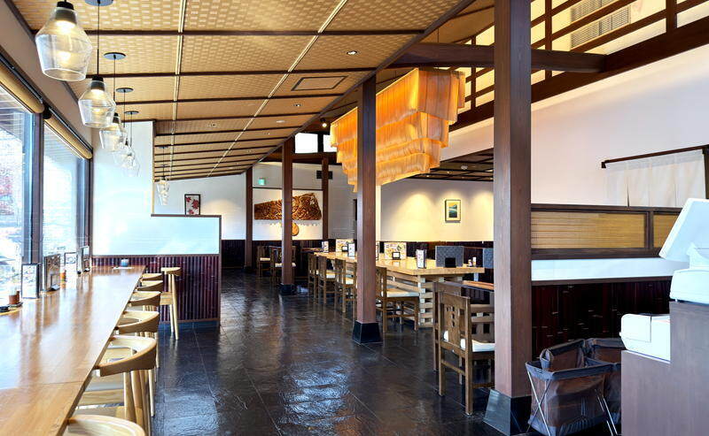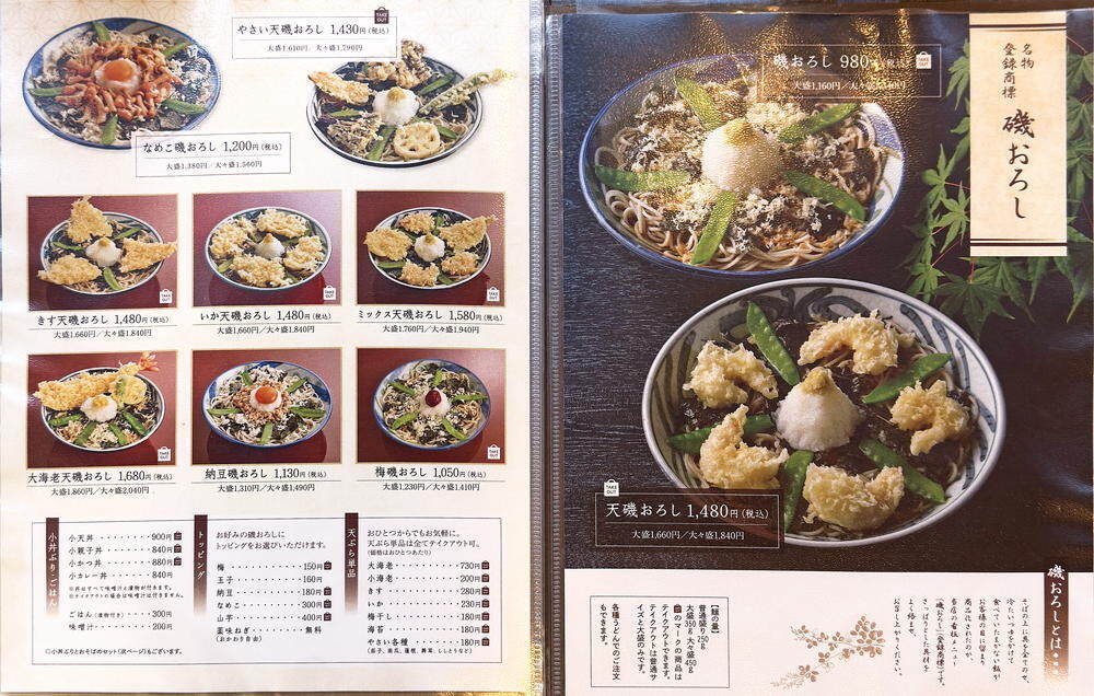 和×スタイリッシュにお洒落な空間で、名物の【磯おろし】をはじめ豊富なそば・うどん・丼ものなどを提供。直営店のメニューはほぼ同じです。