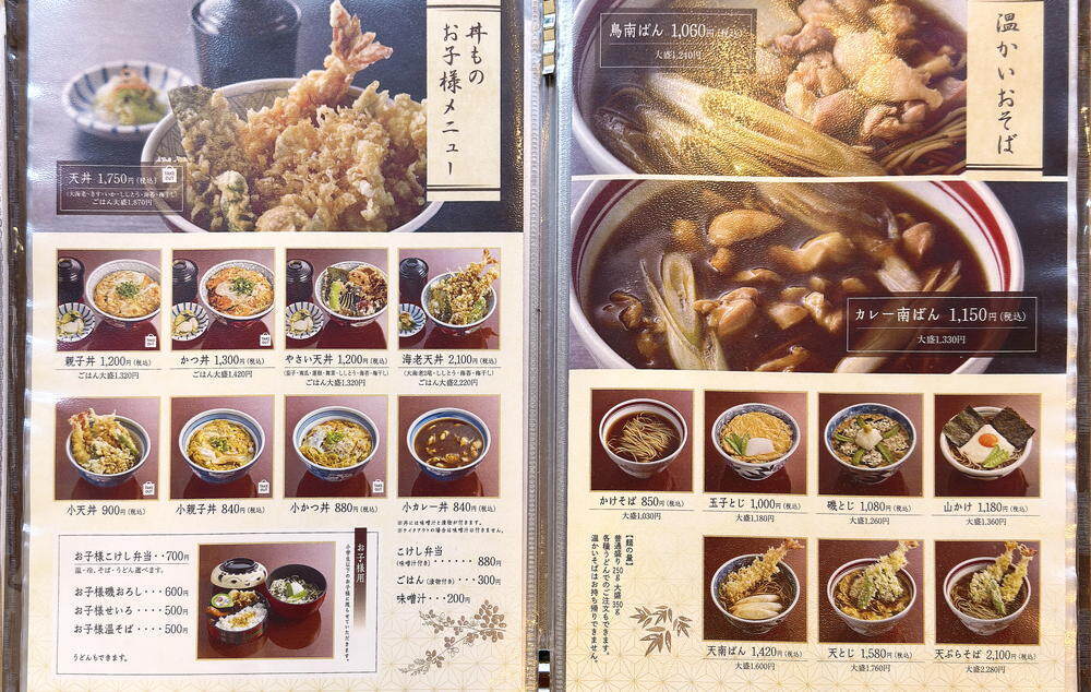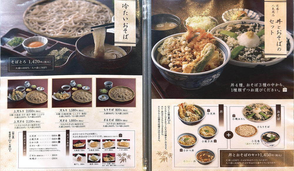 今回のお目当てカレー南蛮ほか、身体の芯から温まりそうなそばも一通り。各種うどんも選べ、単品の丼ものも充実していました。