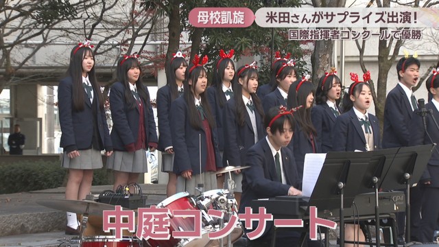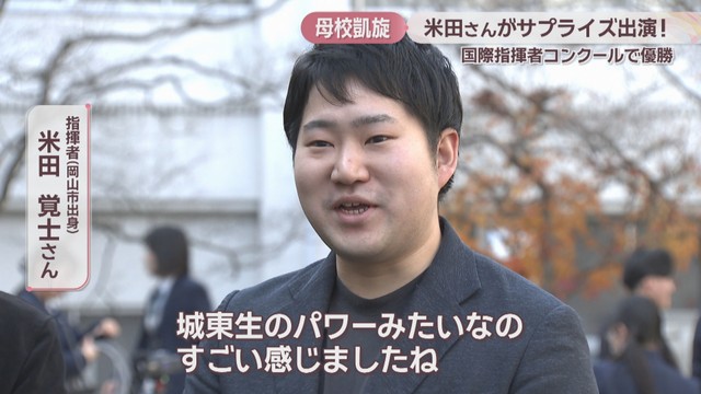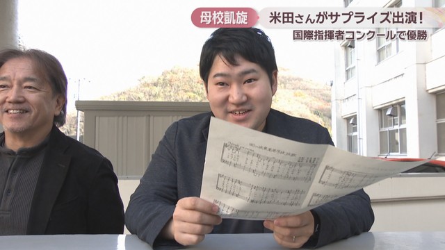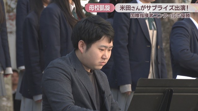 2025年9月、フランスで開かれた「ブザンソン国際若手指揮者コンクール」で優勝した米田覚士さん(29)が16日、母校のコンサートにサプライズで出演しました。