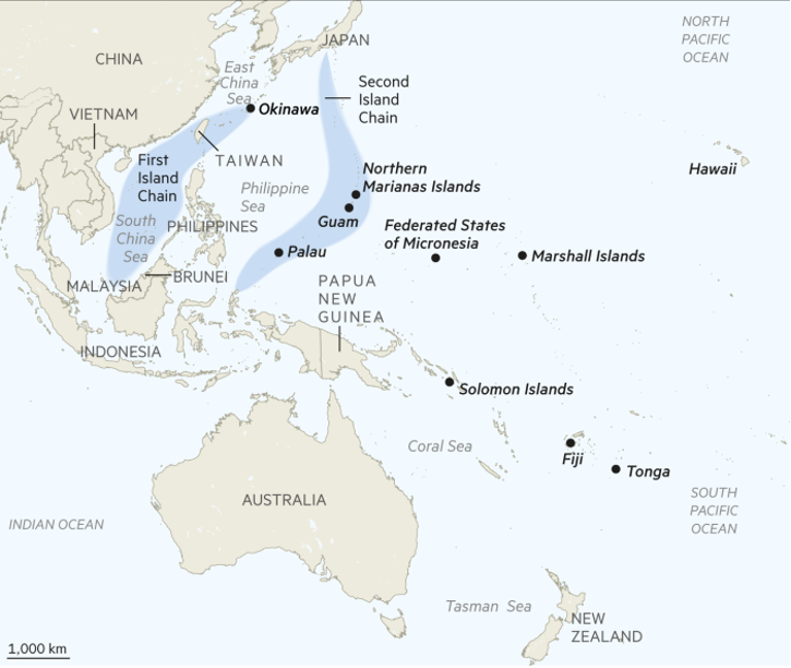 第1列島線(左のハイライト)、第2列島線(右のハイライト) (©Hudson Institute)