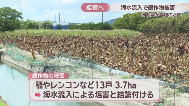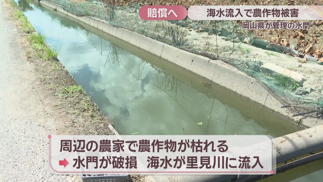 岡山県が管理する倉敷市の水門が破損し、海水が川に流れ込んだ問題です。県は、海水の流入によって周辺の農作物に被害が出たと結論付け、農家に賠償する方針を決めました。