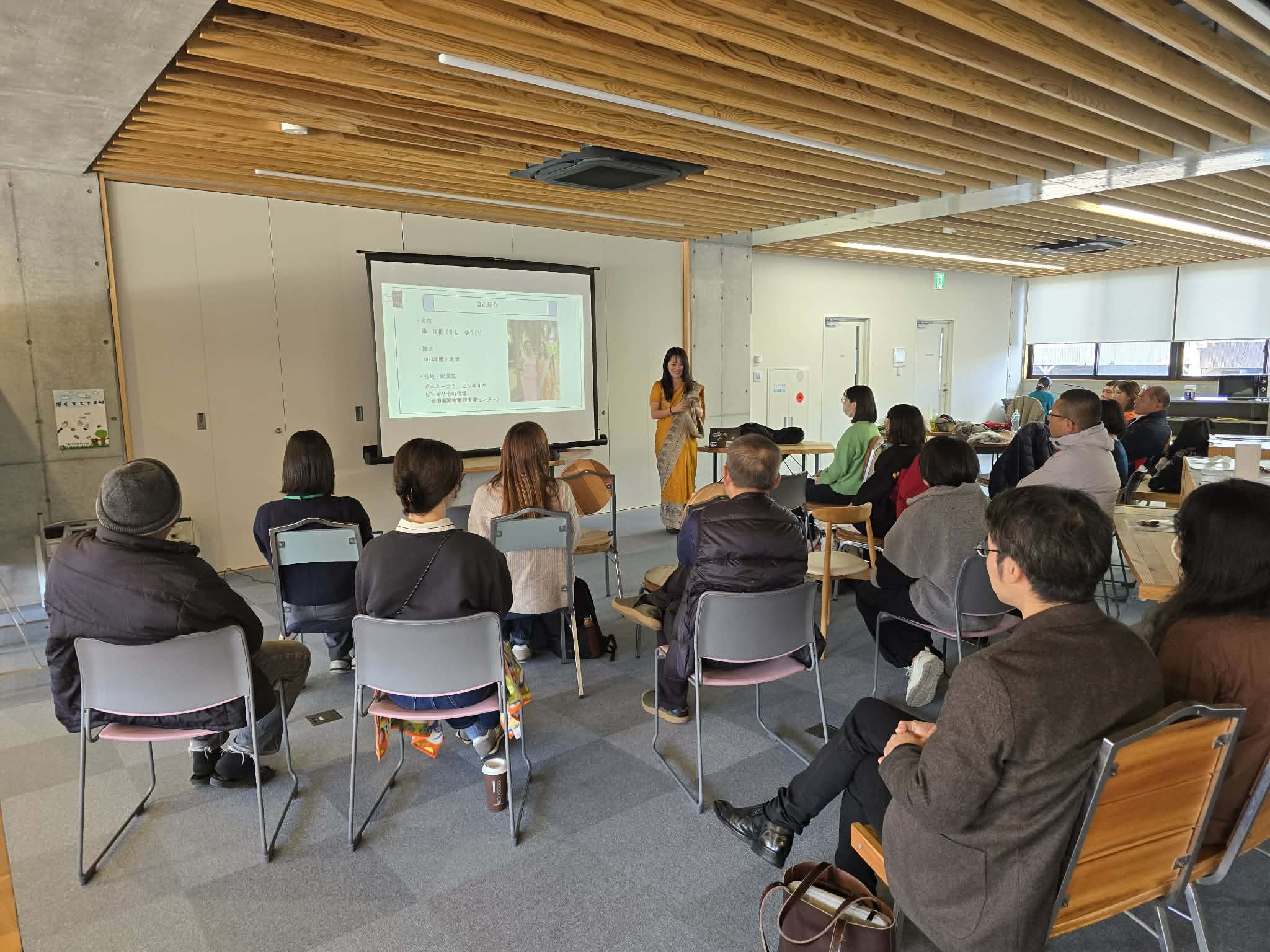 表敬訪問や帰国報告会には、3名がグローカルプログラムでお世話になった方々や協力隊に関心を持つ町民が参加し、それぞれの活動の様子や現地での経験談に熱心に耳を傾けました。会場では久しぶりの再会を喜ぶ声があちこちで交わされていました。