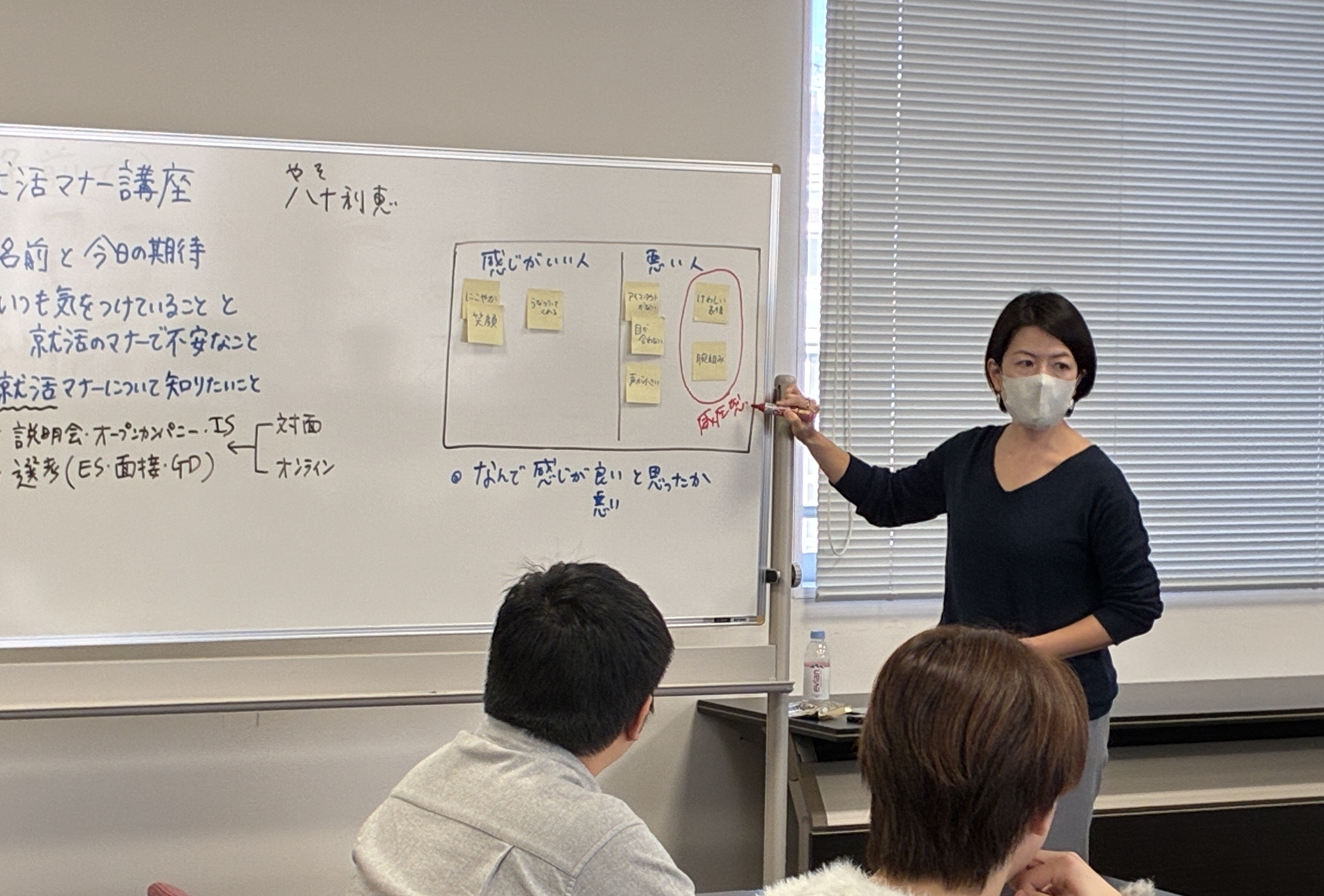 12/16(火)の授業では、人事コンサルタントの八十利恵先生をお招きし、就活マナー講座を実施しました。今回の講座のねらいとして、①就活やマナーについての不安を解消しよう、②就活を進める上で迷った時にどう考えればいいかをつかもう、の2点があげられました。