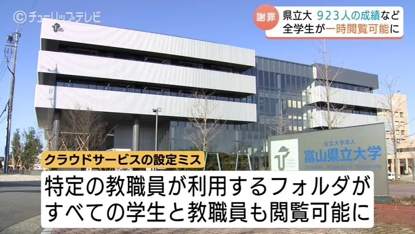 閲覧可能となっていたのは、富山県にある富山県立大学射水キャンパスに通う学生923人分の氏名や成績、非常勤講師の履歴書、他大学の学生が受講した科目の単位取得状況などの個人情報です。