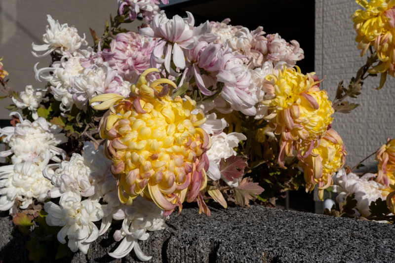 塀の上にあった菊。少し疲れ気味の状態ですが、理想的な位置にフォーカスされますね。