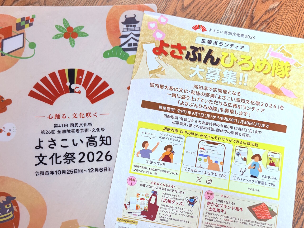 「よさぶんひろめ隊」は、その「よさこい高知文化祭2026」をPRするための、個人参加型の取り組みです。県民一人ひとりが気軽に関われる仕組みとして用意されています。参加方法はとてもシンプル。専用フォームから申し込むと、くろしおくんや「よさこい高知文化祭2026」のロゴなどがあしらわれた広報グッズが届きます。費用は無料です。