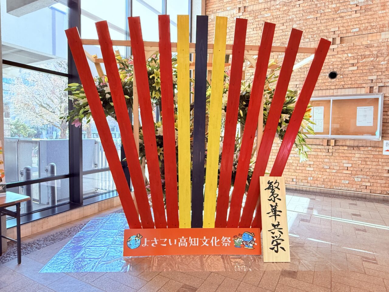 まずは高知県庁へ!2025年12月17日に1階エントランスに「よさこい高知文化祭2026」をテーマにしたオブジェと高知県産のユリの花が飾り付けられました。正面からだとわかりづらいですが、オブジェの後ろにはユリの花がいっぱいです。12月22日15:00まで展示されています。