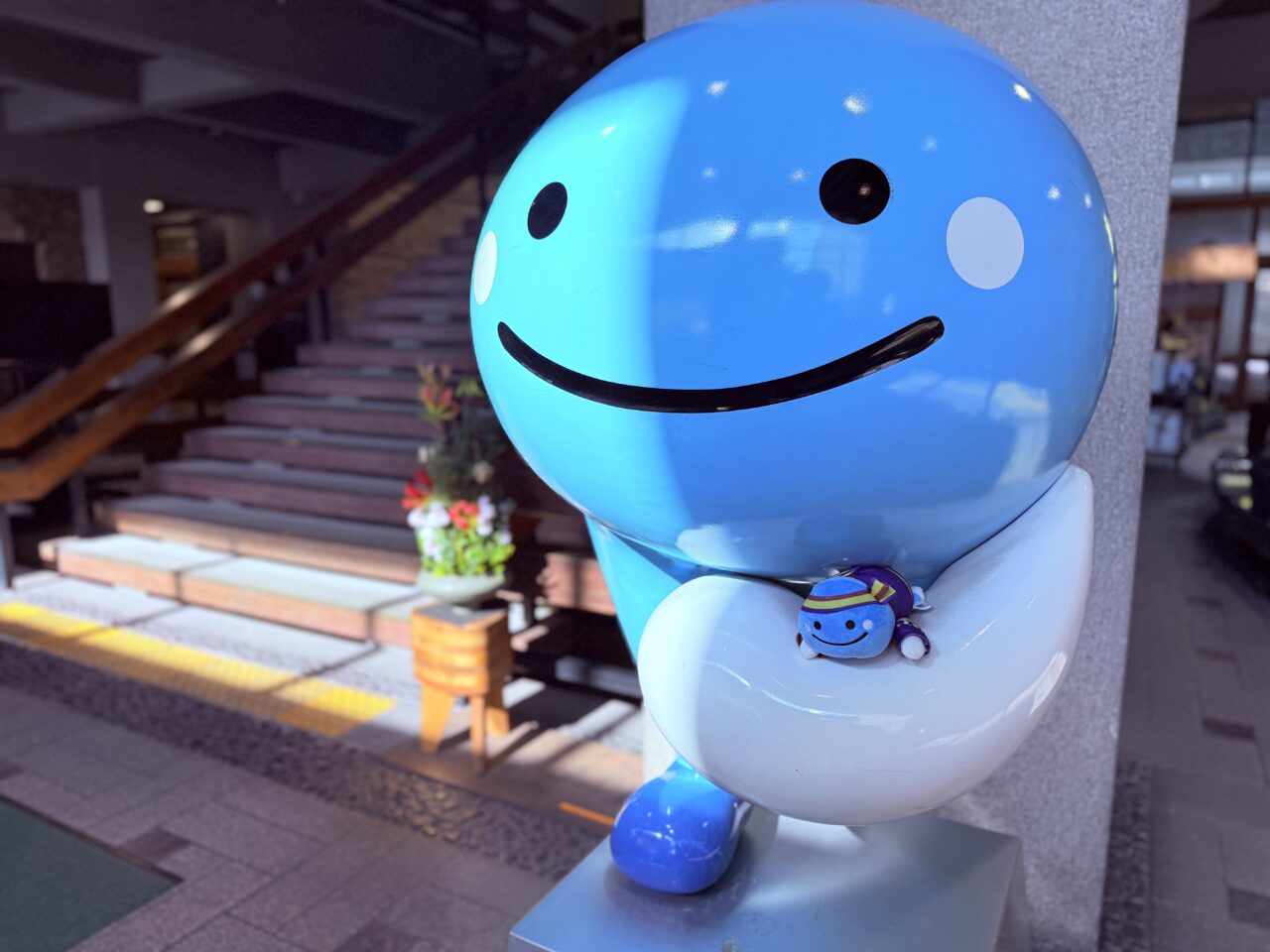 そしてエントランスのくろしおくんのオブジェと一緒に1枚。
