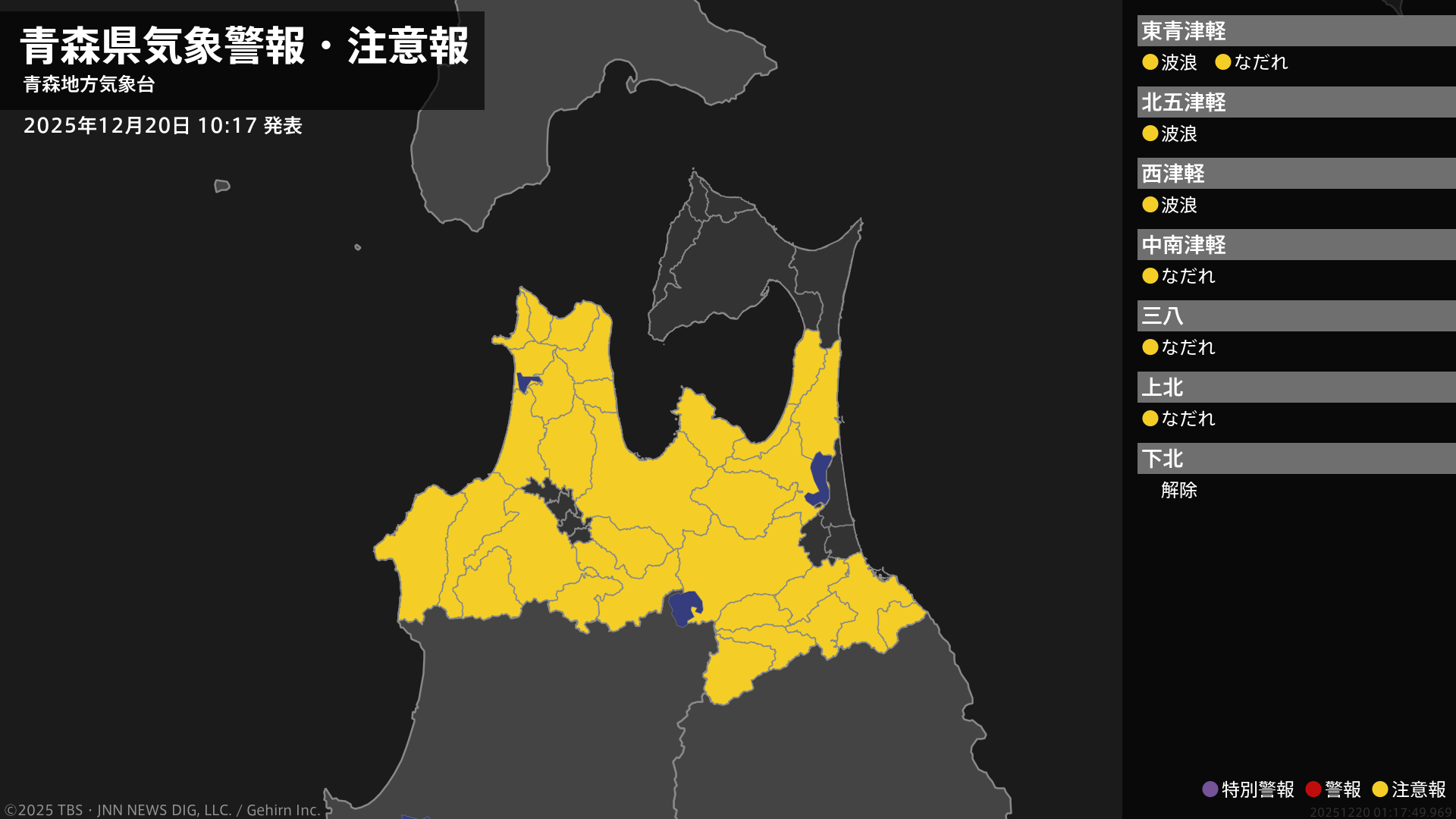 気象台は、午前10時17分に、なだれ注意報を弘前市、八戸市、平川市、平内町、今別町、蓬田村、外ヶ浜町、西目屋村、大鰐町、野辺地町、七戸町、横浜町、東北町、六ヶ所村、三戸町、五戸町、田子町、南部町、階上町、新郷村に発表しました。