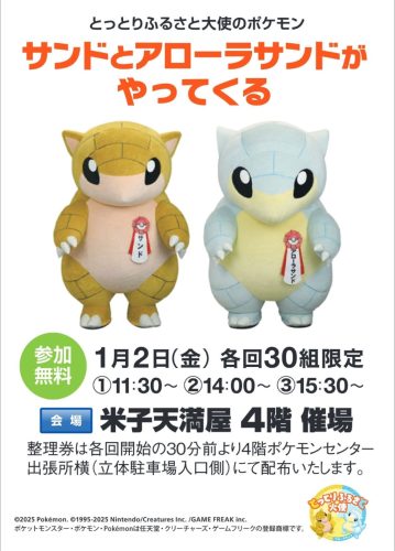 2026年1月2日(金)、サンドとアローラサンドがやってきます。当日は、サンドとアローラサンドとのふれあい&写真撮影会を開催。参加費は無料です。