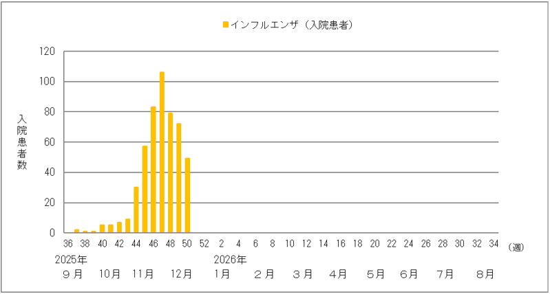 神奈川県の第50週(2025年12月8日~12月14日)のインフルエンザの定点当たり報告数は26.27でした。第45週で警報レベルを超え、流行が継続しています。感染予防と感染拡大の防止のため、こまめに手を洗い、咳が出るときはマスクをするなどの咳エチケットを心がけましょう。また、体調不良のときは無理せず身体を休めましょう。